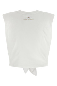 cod. MA01161E2270 Sleeveless cotton jersey cropped t-shirt, structured shoulder straps with logo metal detail, front knot on the hem, 3D logo lettering print on the back. Color: White Size & Fit: true to size fit Composition: 100% cotton Made in: Italy