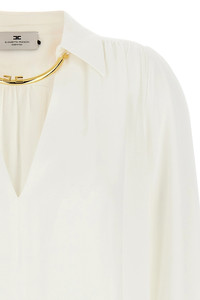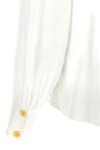 cod. CA12356E2360 Viscose georgette shirt with V-neck, collar with removable metal necklace detail, ruffled shoulders, long cuffed sleeves. Color: White Size & Fit: Slim fit Composition: 100% viscose Made in: Italy