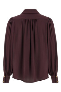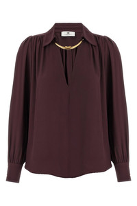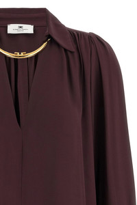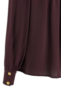 cod. CA12356E2EA4 Viscose georgette shirt with V-neck, collar with removable metal necklace detail, ruffled shoulders, long cuffed sleeves. Color: Purple Size & Fit: Slim fit Composition: 100% viscose Made in: Italy