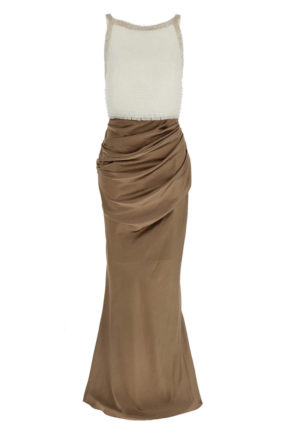 cod. ABR1762E2EZ4 Long 'Red Carpet' dress consisting of an organza upper part with micro flounces structure and piping embroidered with contrasting beads, square neckline, sleeveless, completely bare back and contrast satin skirt with draping on the sides, zip closure and godet insert with back trawl. Color: Multicolor Composition: 100% polyester Made in: Italy