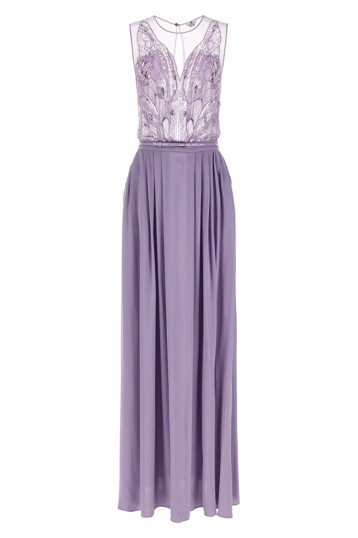 cod. ABR4262E2EV7 'Red Carpet' long dress consisting of removable tulle top embroidered with sequins and micro-crystals degrade effect on the front, crew neck with back button closure and wide teardrop cut-out, sleeveless and wide georgette skirt, wheel model with front pinces, flared silhouette, pockets, back zip closure, removable vinyl matching belt. Color: Purple Size & Fit: true to size fit Composition: 100% viscose Made in: Italy