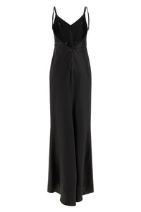 cod. ABR3362E2110 Long satin Red Carpet dress, fitted fit, front and back neckline, thin straps with gold metal logo detailing, front ruffles at the top, back zip closure, mermaid tail on the bottom. Color: Black Size & Fit: True to size fit Composition: 97% polyester, 3% elastane Made in: Italy