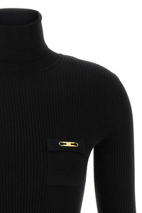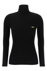 cod. MK11B56E2110 Ribbed stretch silk blend turtleneck sweater, satin trompe l'oeil pocket with metal logo detail, turned-up high neck, long sleeves. Color: Black Size & Fit: Slim fit Composition: 64% ly, 20% pa, 16% se Made in: China