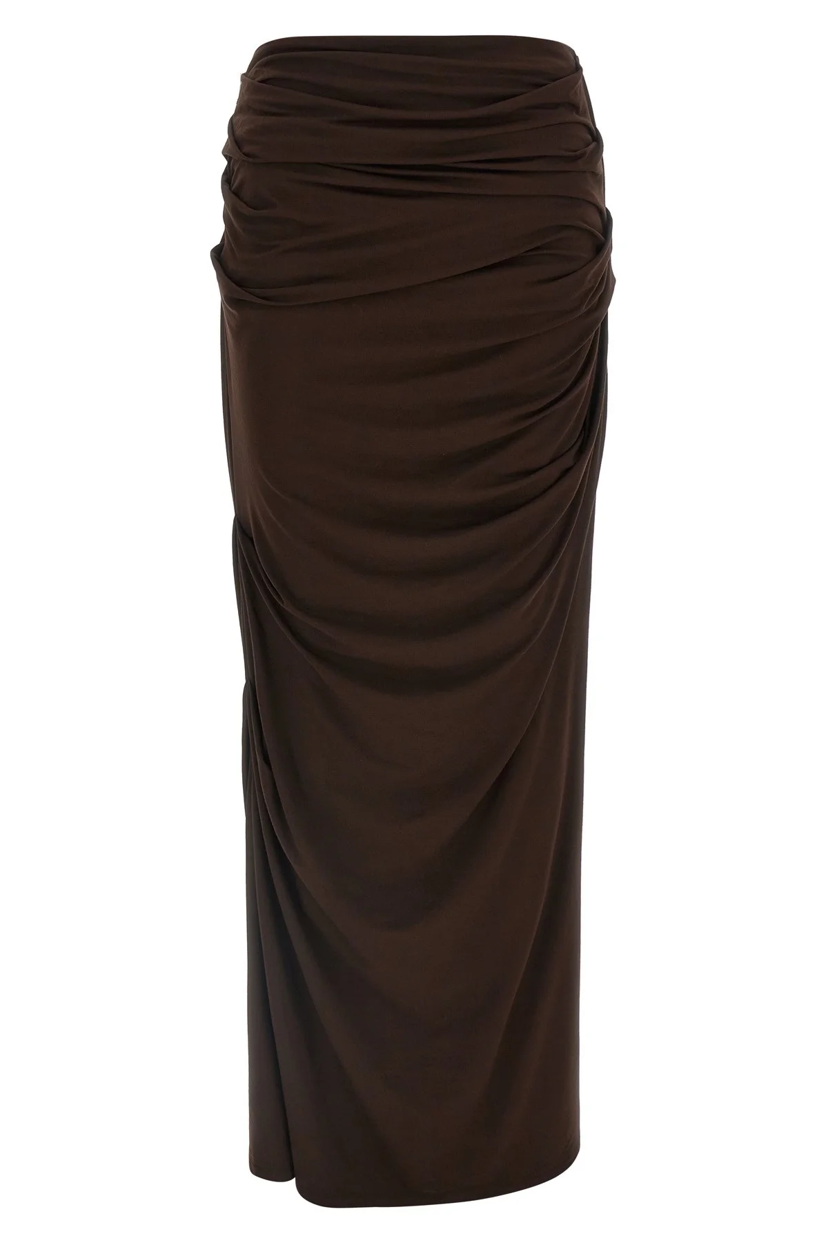 cod. ESSS26SK01243C737 245 g/m² long 'Drape' stretch viscose skirt with front and back draping, and elastic band at the waist. Color: Brown Size & Fit: true to size fit Composition: 92% viscose, 8% elastane Made in: China