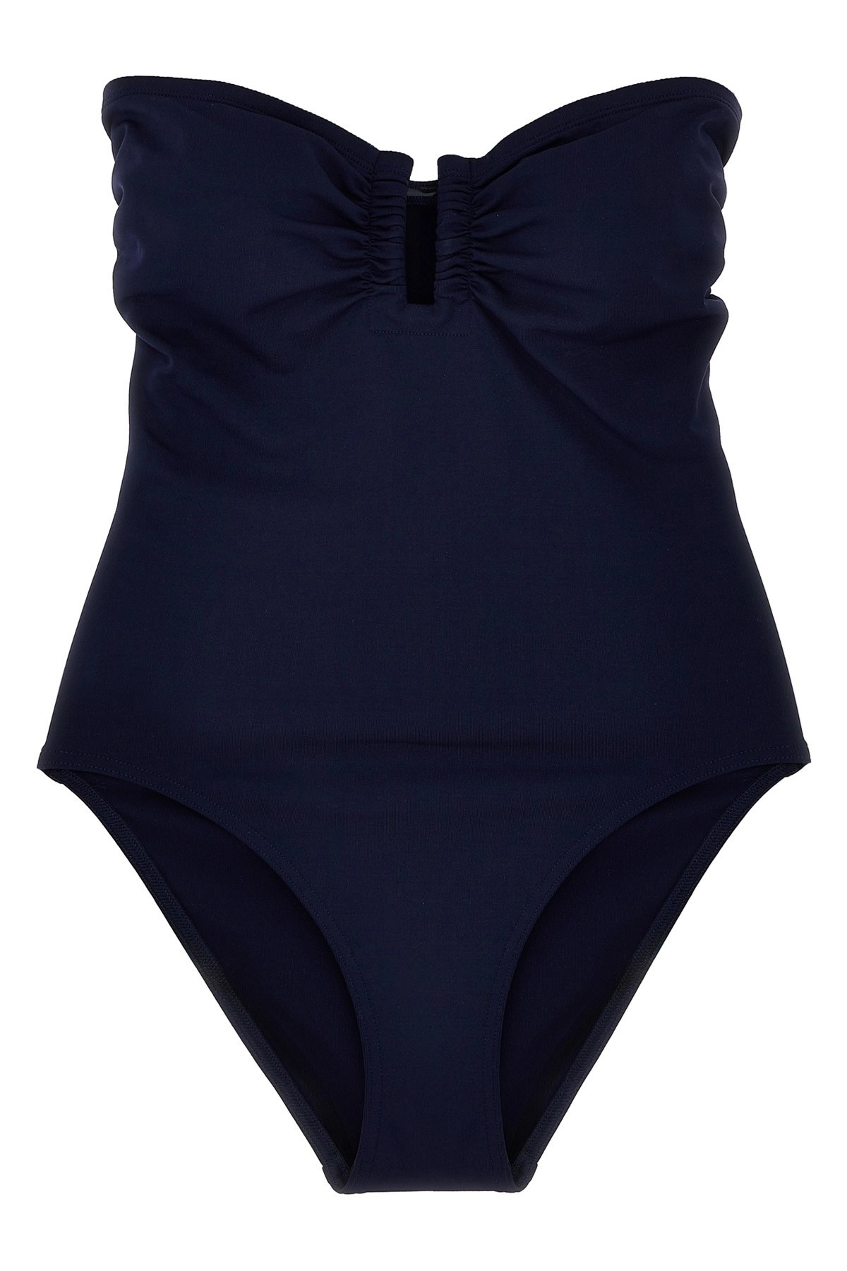 cod. 011406NAUTIQUE 'Cassiopee' Peau Douce* fabric one-piece swimsuit with pleated cups separated by a U-shaped underwire. Color: Blue Size & Fit: true to size fit Eres size Composition: 84% polyamide, 16% spandex Made in: Italy