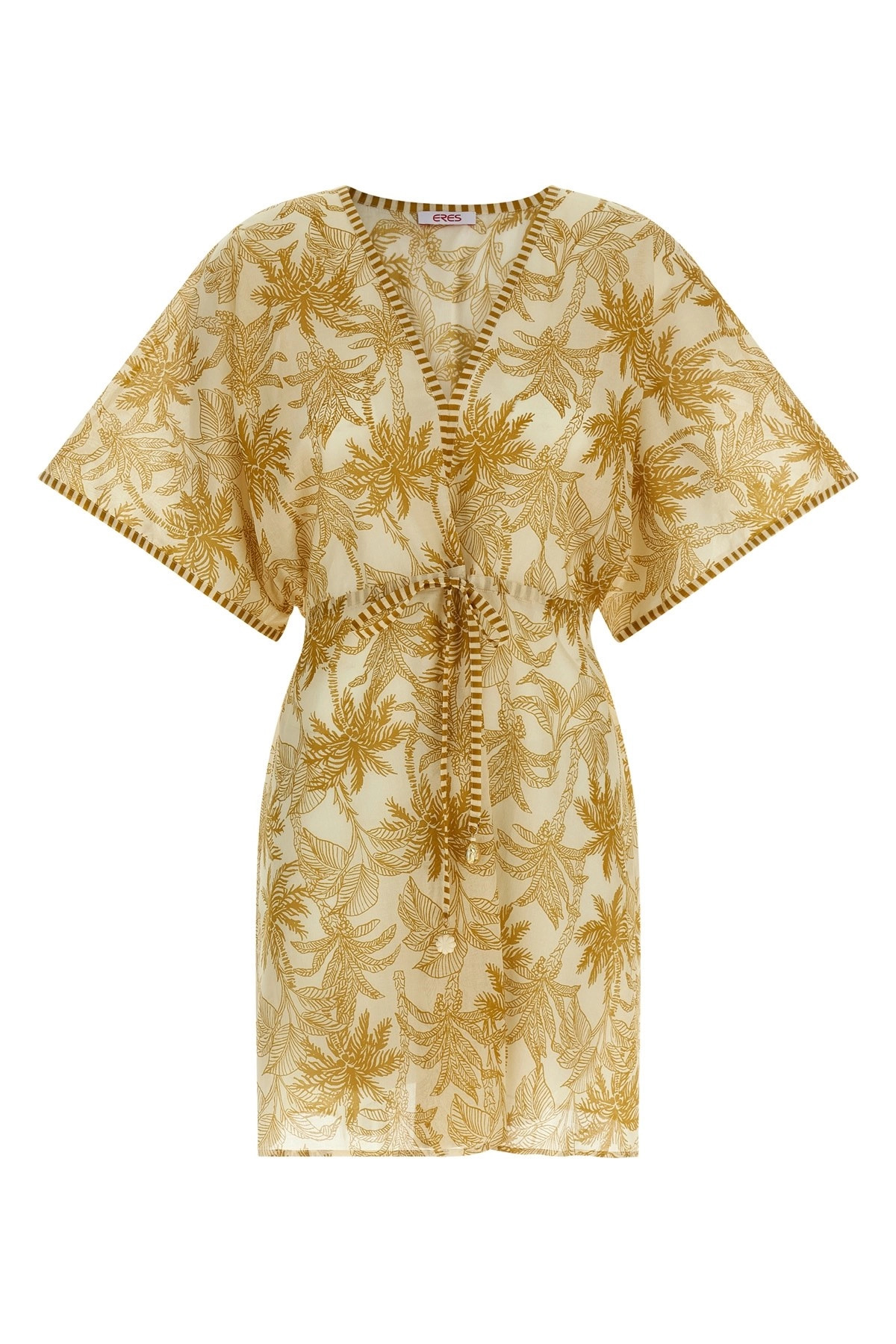 cod. 202607IMPVOYAGEPANAMA Peninsule' kaftan dress in all-over print cotton voile with V-neck, front drawstring adjustable at the waist and elastic at the back, short and wide sleeves, front drawstring at the waist and elastic at the back. Color: Beige Size & Fit: True to size fit Composition: 100% cotton Made in: France