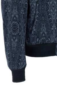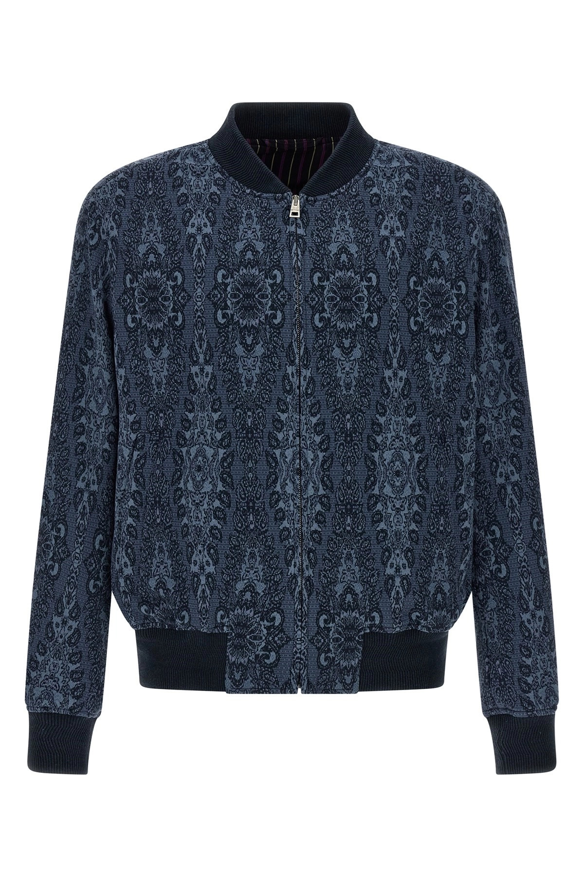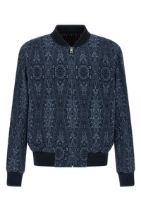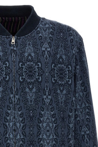 cod. MRBA001699JJE14B0065 Jacquard cotton and viscose blend bomber jacket with ribbed cotton knit inserts, zip closure, pockets, long cuffed sleeves. Color: Blue Size & Fit: true to size fit Composition: 46% cotton 36% polyester 15% viscose 2% polyamide 1% elastane Made in: Romania