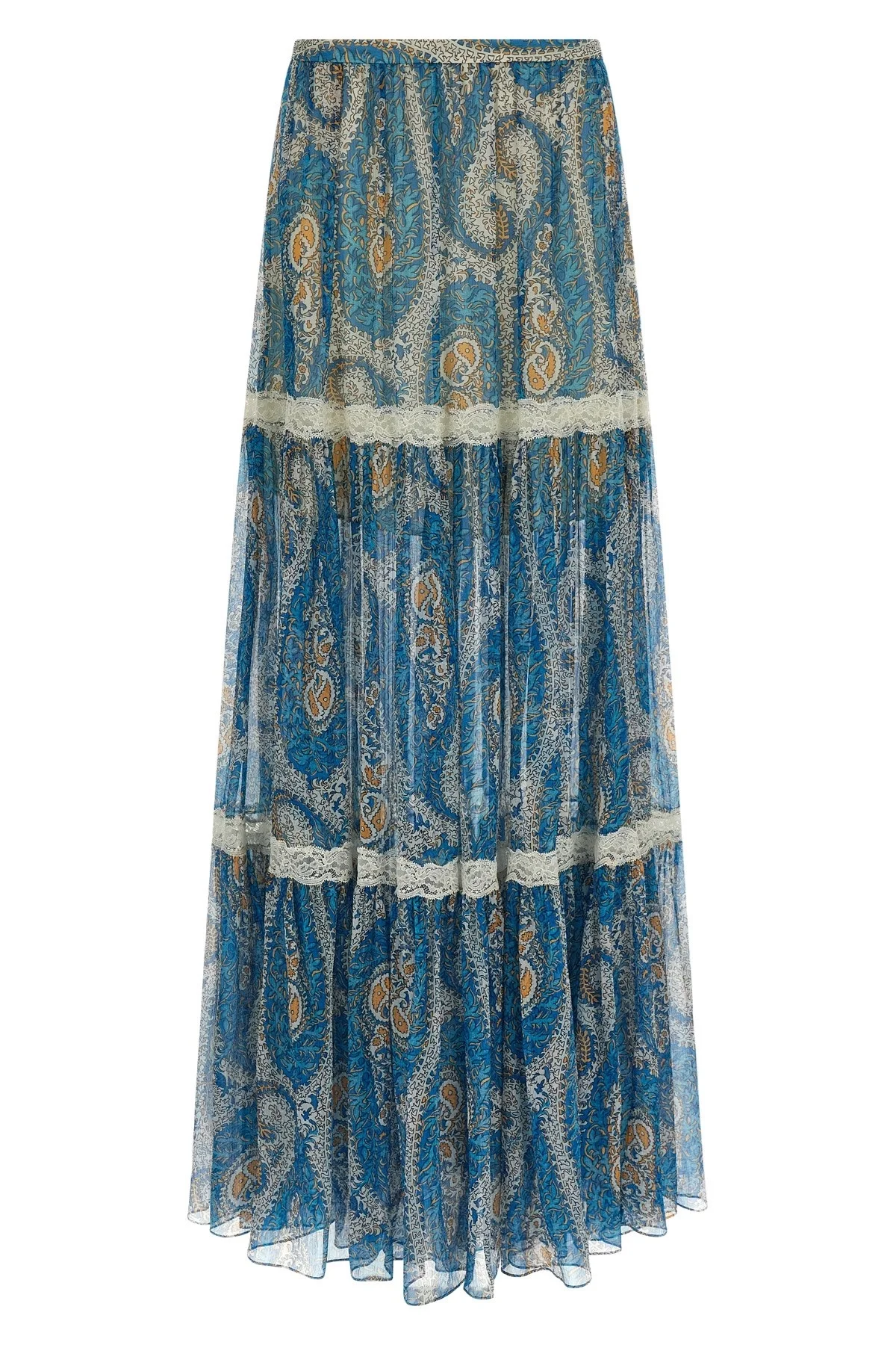 cod. WRFA018399SA1O1X0809 Long skirt in patterned silk with contrasting lace inserts, wide model with curls, back zip closure, underskirt. Color: Light Blue Size & Fit: true to size fit Composition: 100% silk Made in: Italy