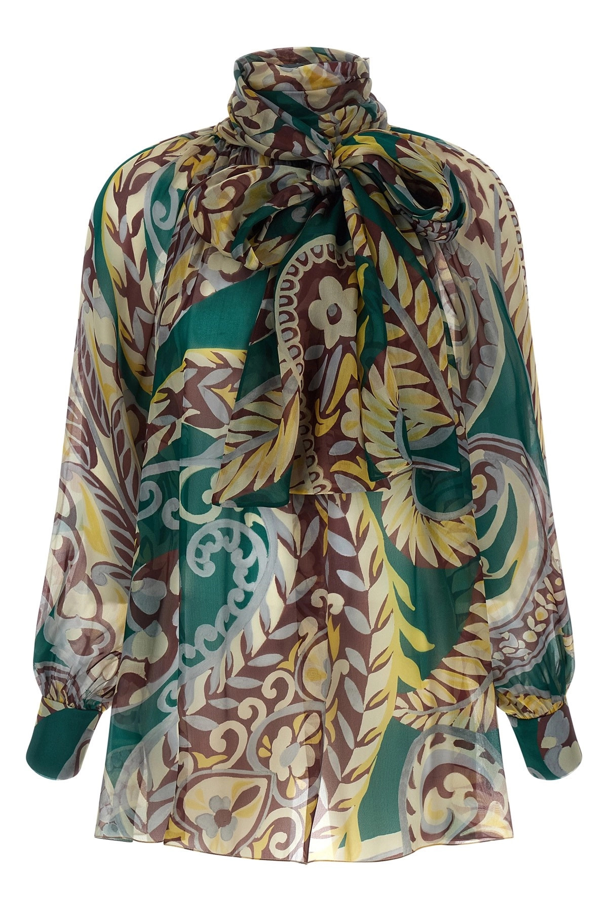 cod. WRJA015099SA1K3X0890 All-over Paisley print washed silk organza blouse, lavalliere high neck with back button closure, teardrop cut-out detail, and long raglan sleeves with cuffs. Color: Multicolor Size & Fit: true to size fit Composition: 100% silk Made in: Italy