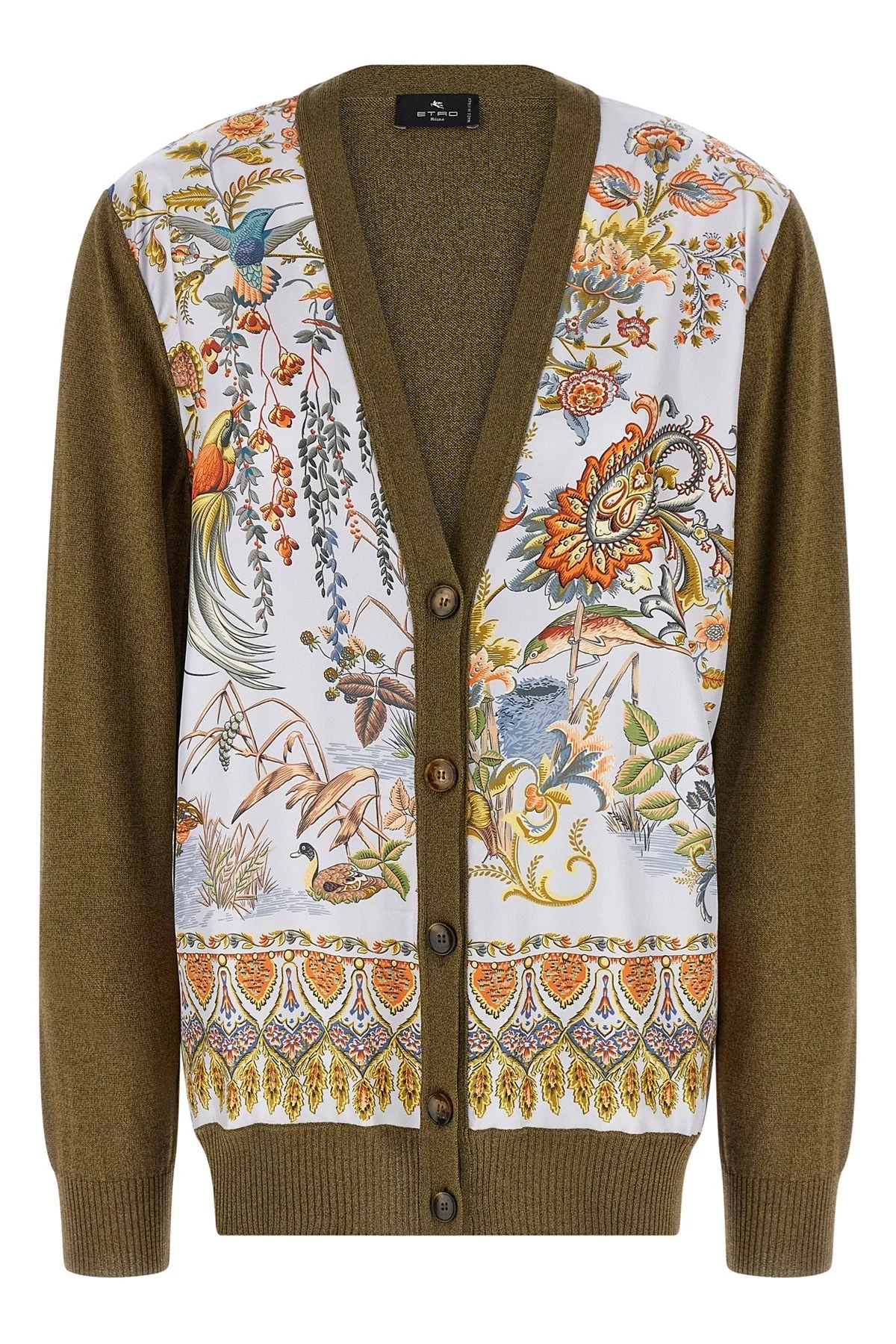 cod. WRKE0182AV868X0882 Cardigan in cotton blend and solid color viscose with silk insert Paisley foliage pattern on the front, V-neck, button closure, long cuffed sleeves, band on the hem. Color: Green Size & Fit: true to size fit Composition: 60% cotton 40% viscose Made in: Italy
