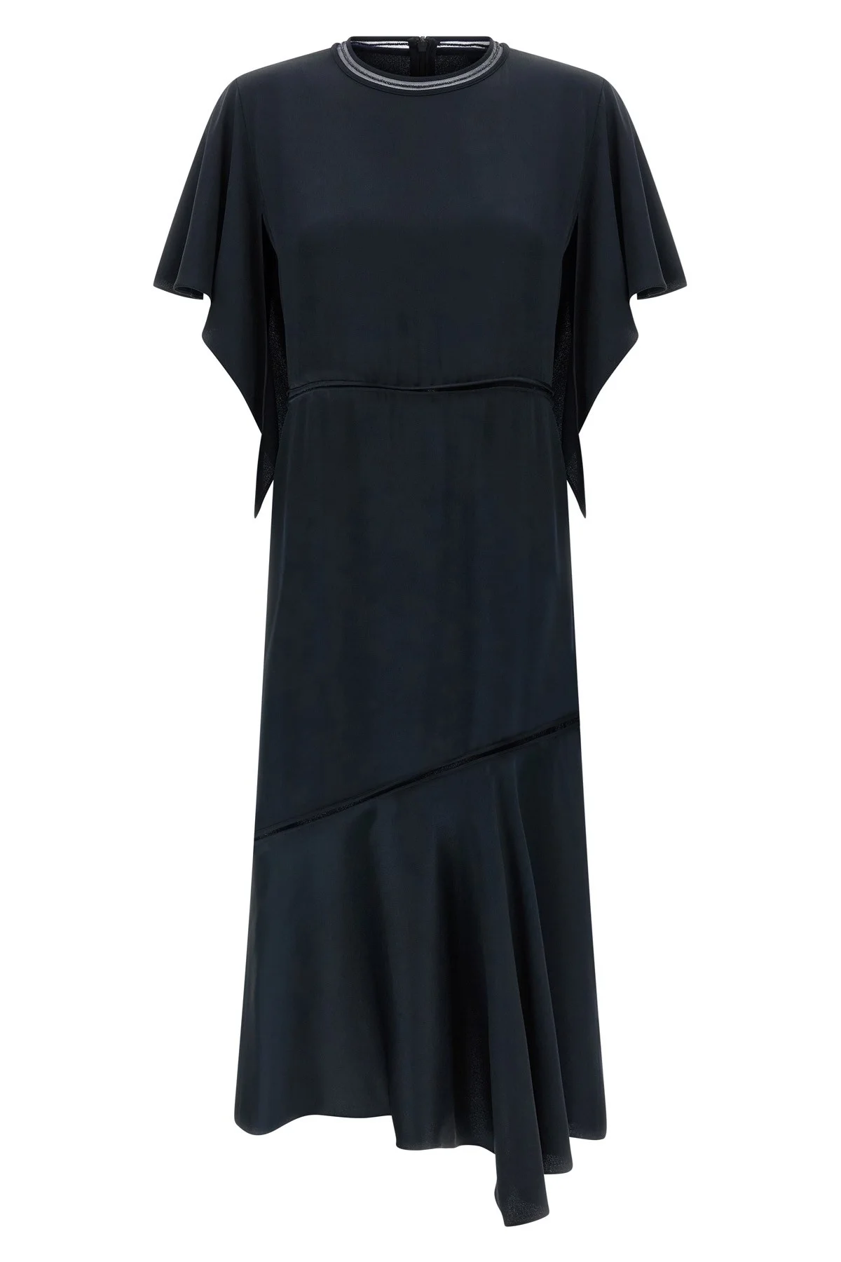 cod. ABD266F187L7805146 Silk-effect fabric midi dress, crew neck, cut-out details with transparent mesh, ruffle sleeves joined by a back sash, back zip closure, asymmetrical length. Color: Blue Size & Fit: True to size fit Composition: 54% viscose, 46% acetate Made in: Italy