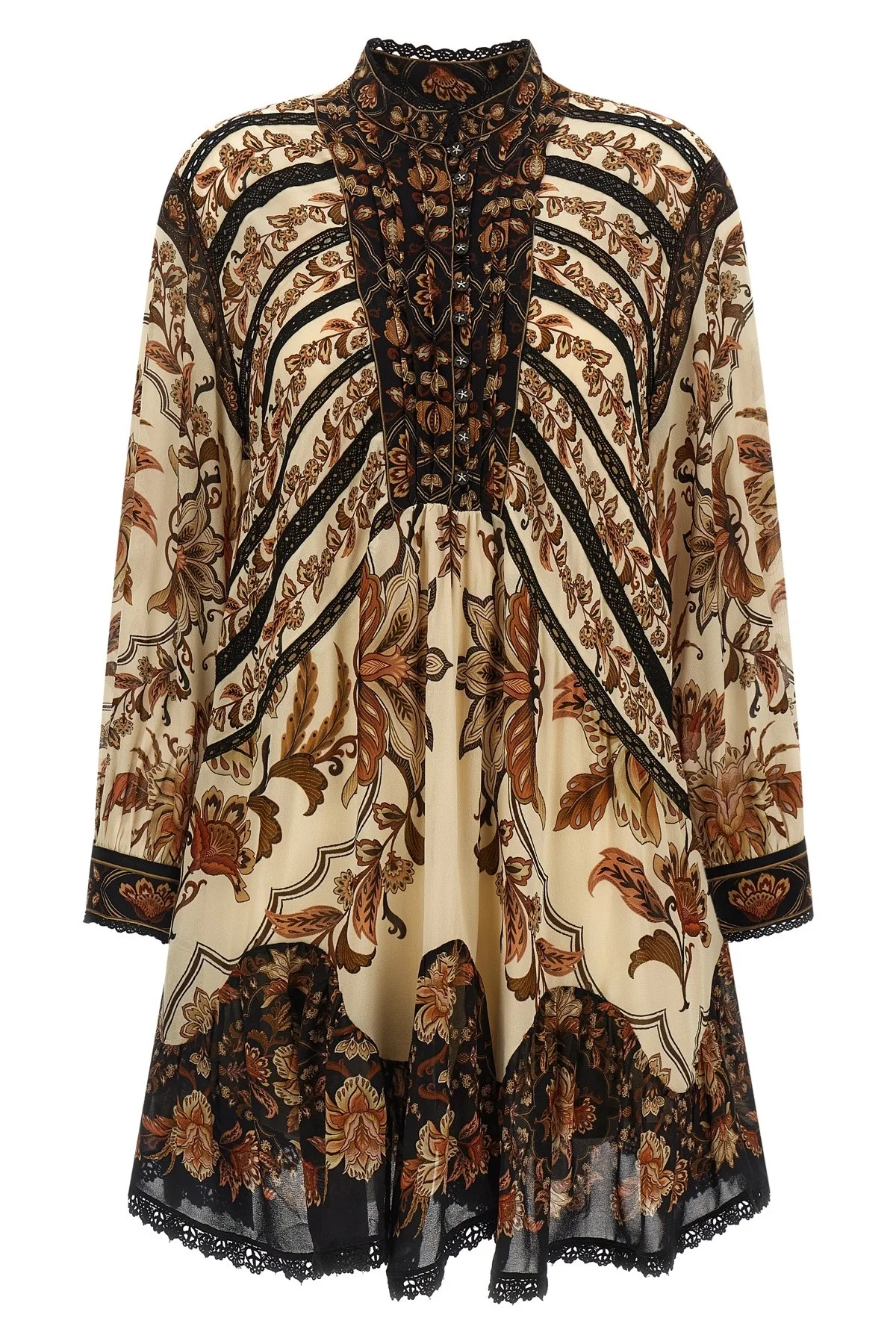 cod. 34397426069 Mini 'Majestic garden sand' dress in floral print fabric, embroidered lace front inserts, mandarin collar with goatee details, front closure with jewel buttons, detachable petticoat, ruffle on the hem, long sleeves with cuffs and buttons. Color: Beige Size & Fit: True to size fit Composition: 100% viscose Made in: India