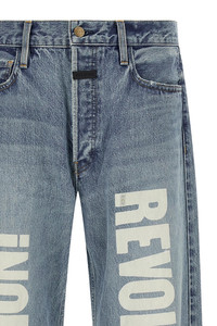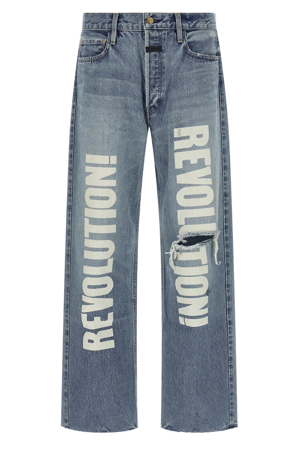 cod. FG25FW4545401KDNMLIGHTINDIGO 'Revolution' handmade Japanese cotton denim jeans with used-effect details, distressed and front print, straight leg, button closure with leather logo patch, five pockets. Color: Blue Size & Fit: Relaxed fit Composition: 100% cotton Made in: Japan