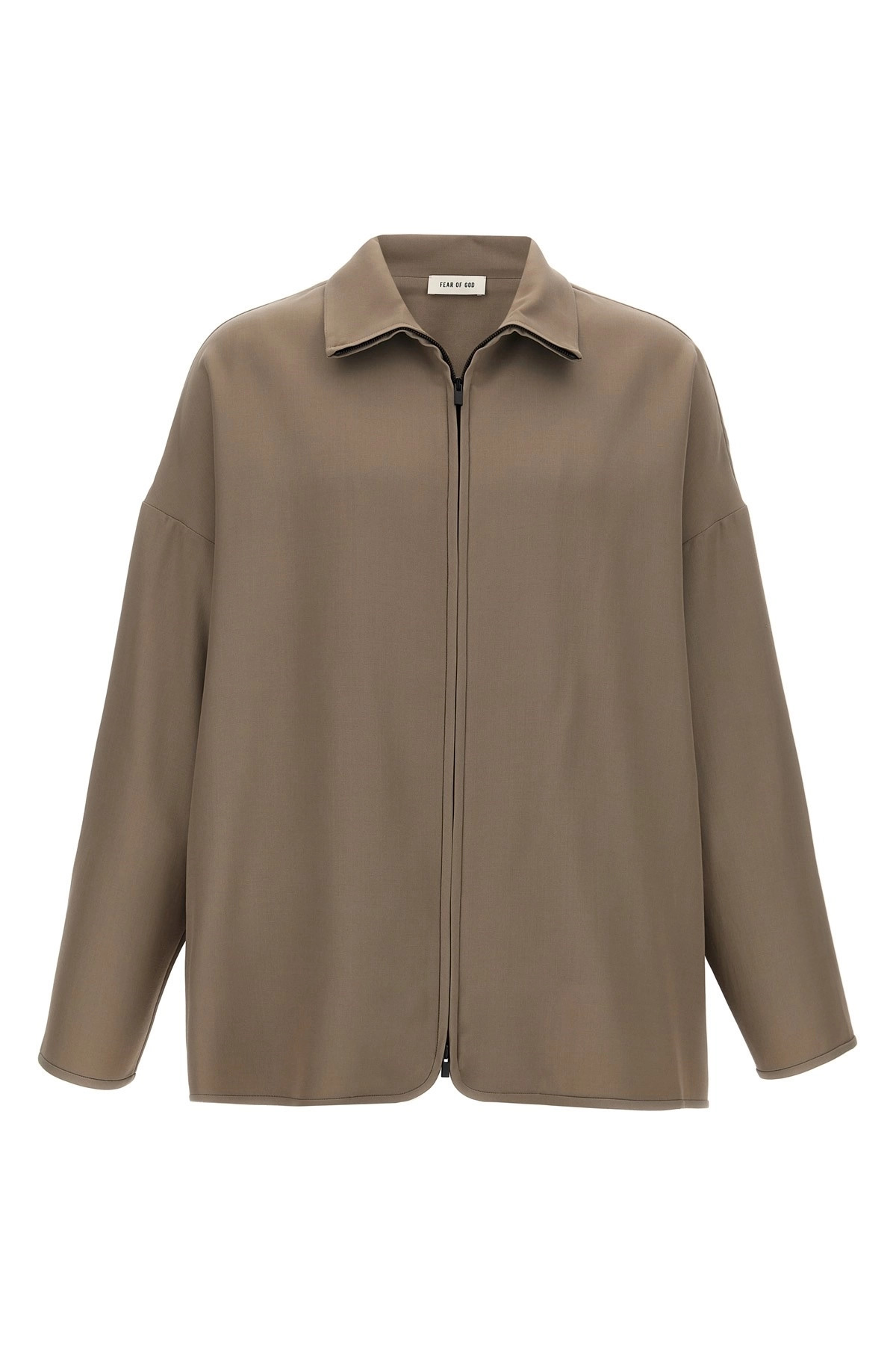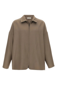 cod. FGE230306WVSDUSTYBEIGE Virgin wool and viscose blend jacket, back leather logo patch, high neck, zip closure, pockets, long sleeves with dropped shoulders. Color: Beige Size & Fit: oversized fit Composition: 65% virgin wool 35% viscose Made in: Italy