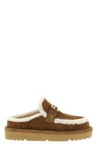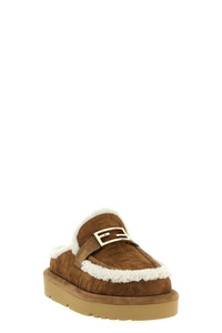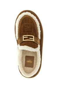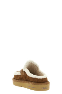 cod. 8R8777ASA1F0C23 Apres Chic' suede sabots with FF pattern and sheepskin lining, front FF 'Baguette' metal buckle, chunky rubber sole with contrast insert and logo lettering on the heel. Color: Multicolor Size & Fit: EU WOMEN Composition: 100% calfskin leather (Bos Taurus) Made in: Italy