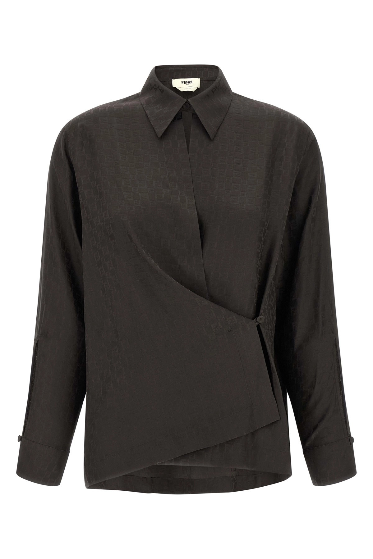 cod. FS8287AUQGF1T6H 'Chess FF' silk jacquard shirt with all-over 'FF' pattern, side crossed button closure, collar, long cuffed sleeves. Color: Brown Size & Fit: True to size fit Composition: 100% silk Made in: Italy