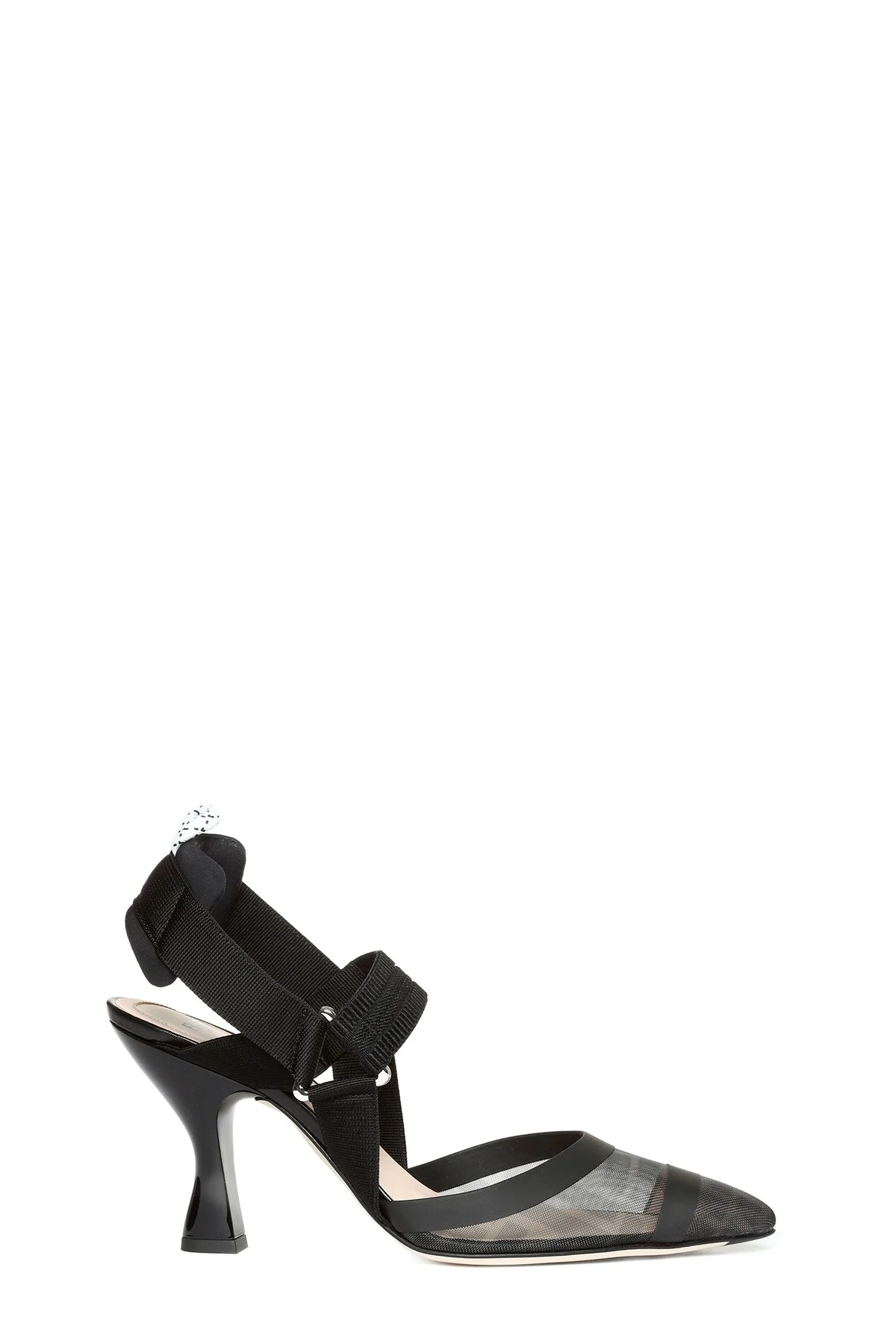 cod. 8J6851A8UGF0MQ0 'Colibri' mesh slingback with iconic FF motif, leather and grosgrain ribbon details, pointed toe, padded back strap with trekking hook, elastic upper strap, heel, leather sole. Color: Black Size & Fit: EU WOMAN - Heels: 8.5 cm Composition: 80%pa 20% CALF leather Made in: Italy