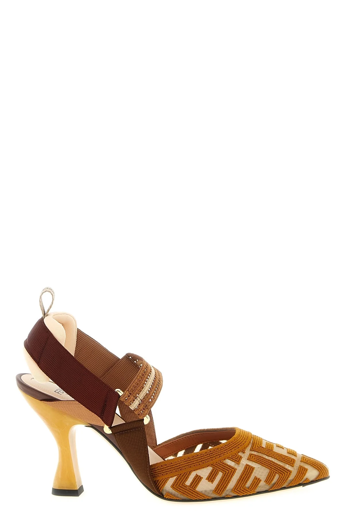 cod. 8J8875AWCXF1V8T 'Colibri' mesh slingbacks with Cornely FF embroidery, pointed toe, back strap with padded pad and trekking hook, elastic top strap, resin-coated heel with marbled effect, leather sole with rubber island. Color: Brown Size & Fit: EU WOMAN - Heels: 8,5 cm Composition: 100% polyamide Made in: Italy