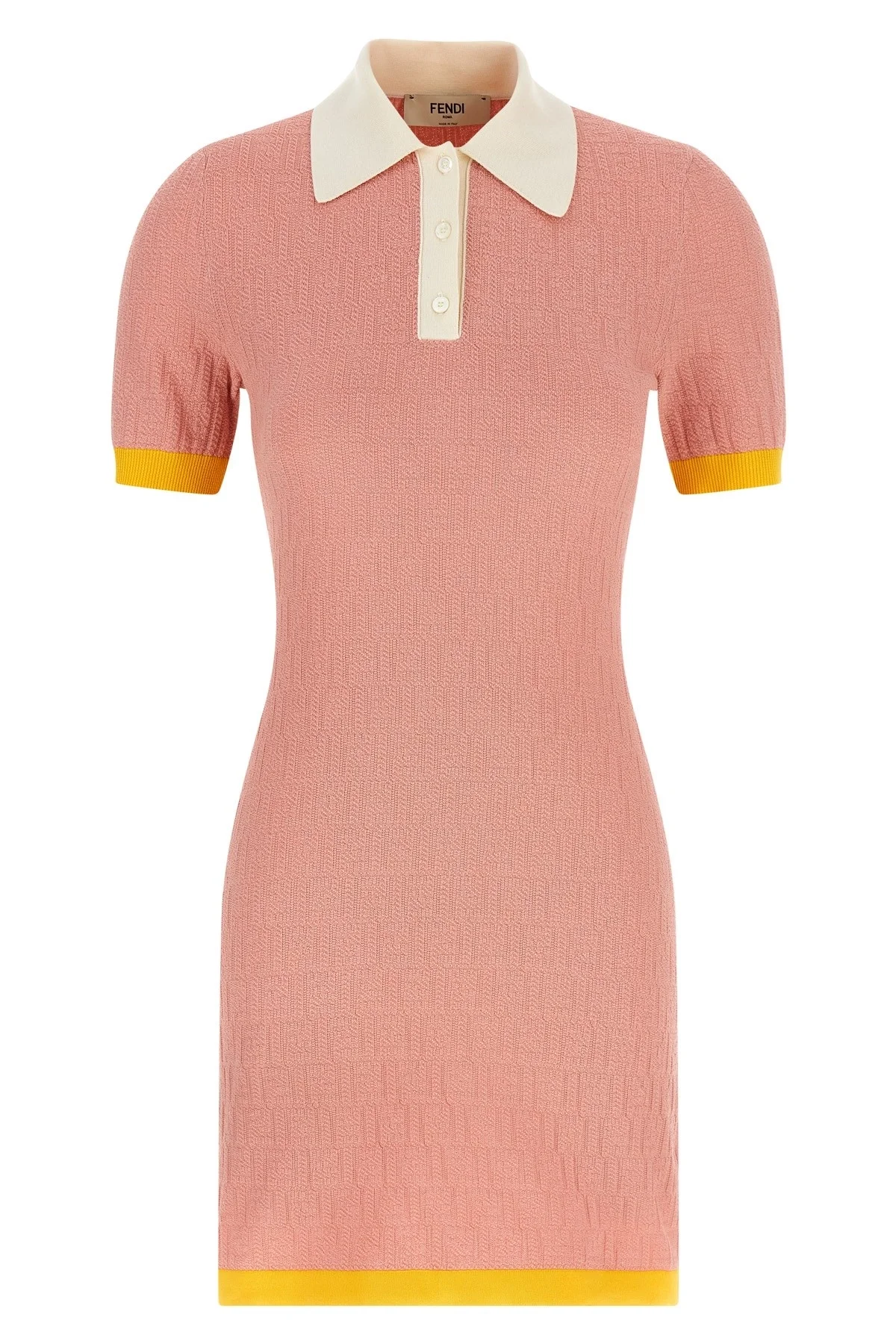 cod. FZDE35AW4SF1W0S FF jacquard color-block stretch cotton and silk blend minidress with contrast details, polo shirt style with collar and buttons, hourglass silhouette, short cuffed sleeves. Color: Pink Size & Fit: true to size fit Composition: 70% cotton 25% silk 4% polyamide 1% elastane Made in: Italy