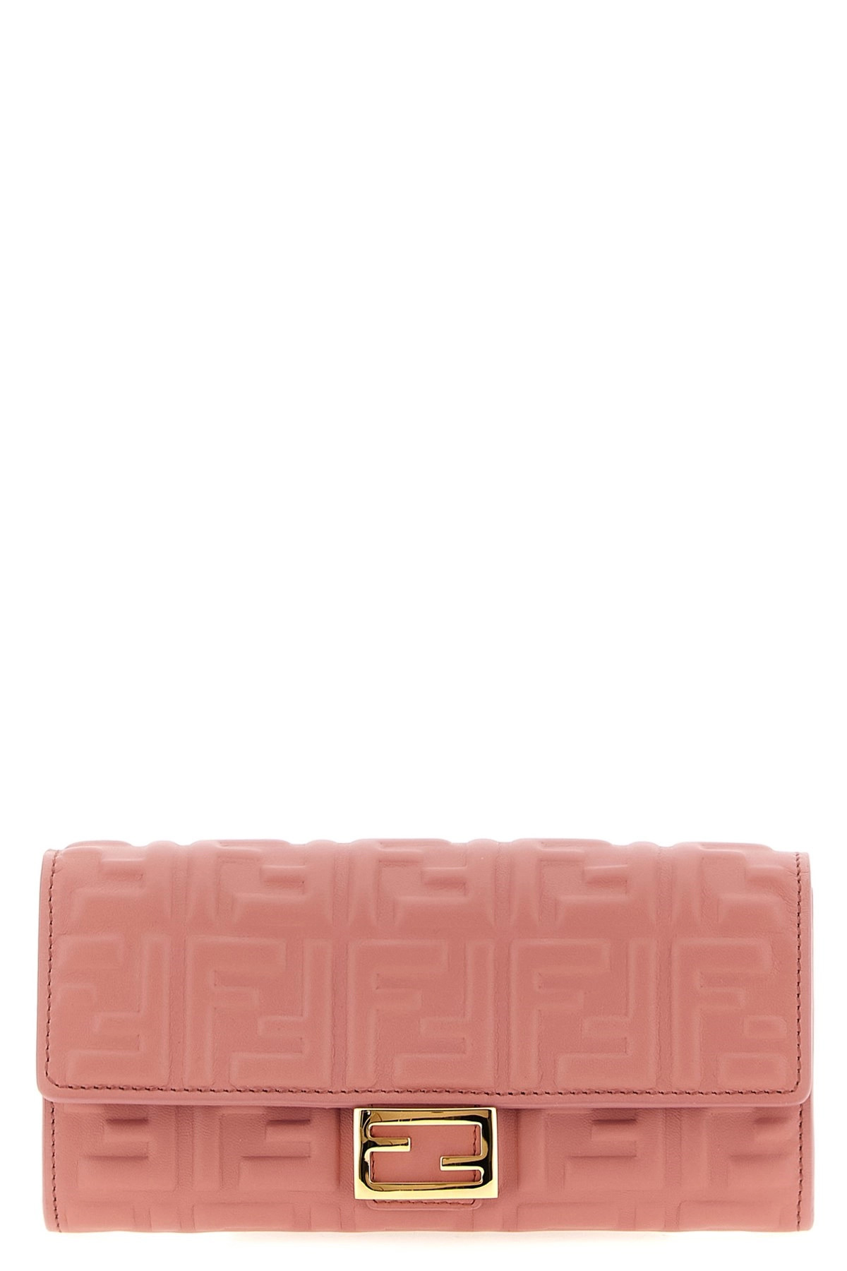 cod. 8M0365AAJDF13VM 'Continental Baguette' nappa leather wallet on chain with iconic embossed FF pattern with a three-dimensional effect, flap closure with snap button and front metal logo, removable chain shoulder strap. Color: Pink Size & Fit: W 19 x H 9 x D 1 cm Composition: 100% lamb leather (Ovis aries) Made in: Italy
