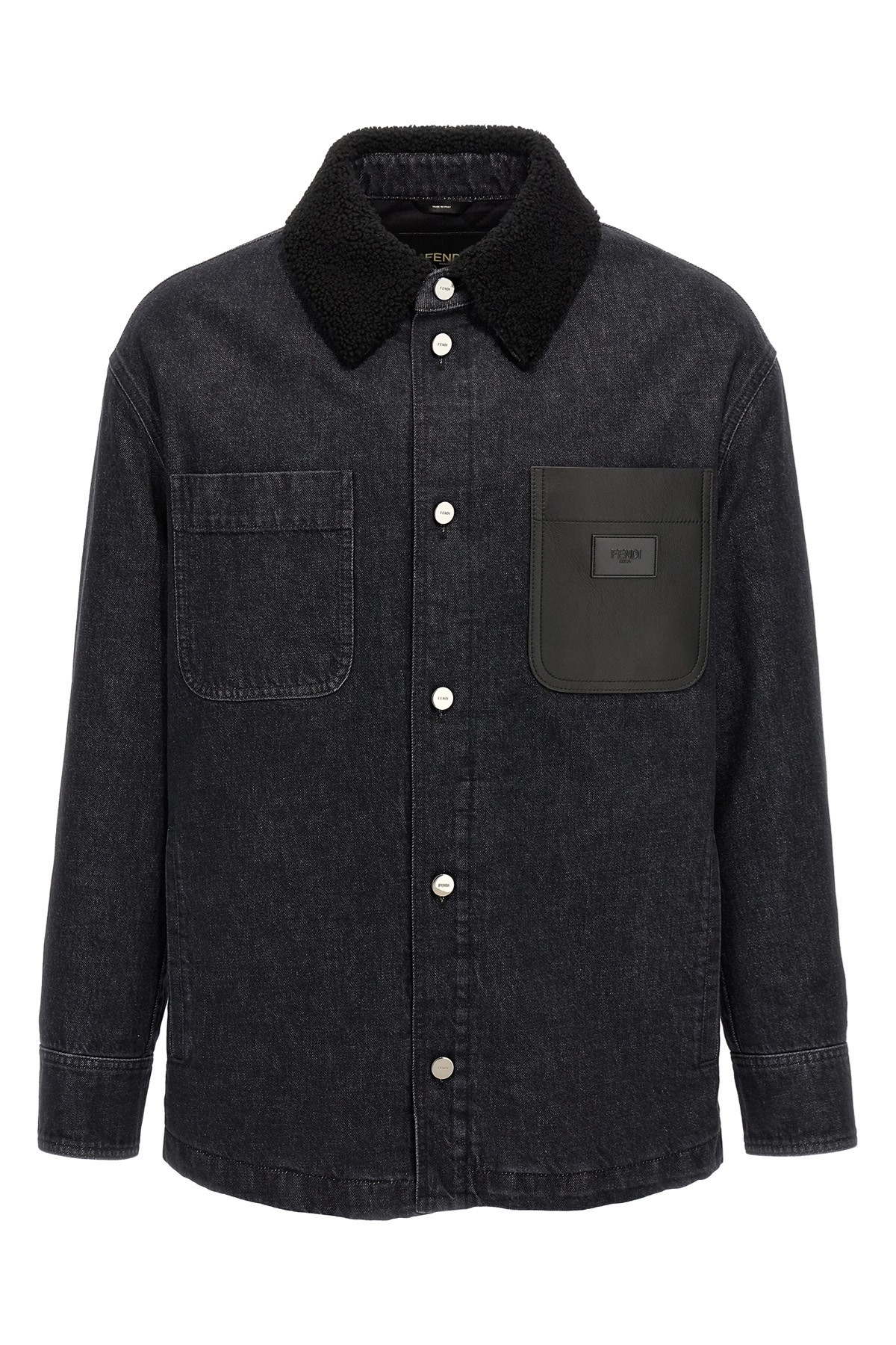 cod. FW1363ATK7F0QA1 Lightly padded cotton denim jacket with tone-on-tone sheepskin collar, leather pocket with logo patch, button closure, pockets, long cuffed sleeves. Color: Black Size & Fit: true to size fit Composition: 100% cotton Made in: Italy