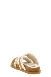 cod. 8X8710AY9RF1TOO 'Fendi Feel' sheepskin sandals with FF pattern, double band and FF Baguette metal buckle, contrast fur trims, rubber sole. Color: Beige Size & Fit: EU WOMEN Composition: 100% calfskin leather (Bos Taurus) Made in: Italy