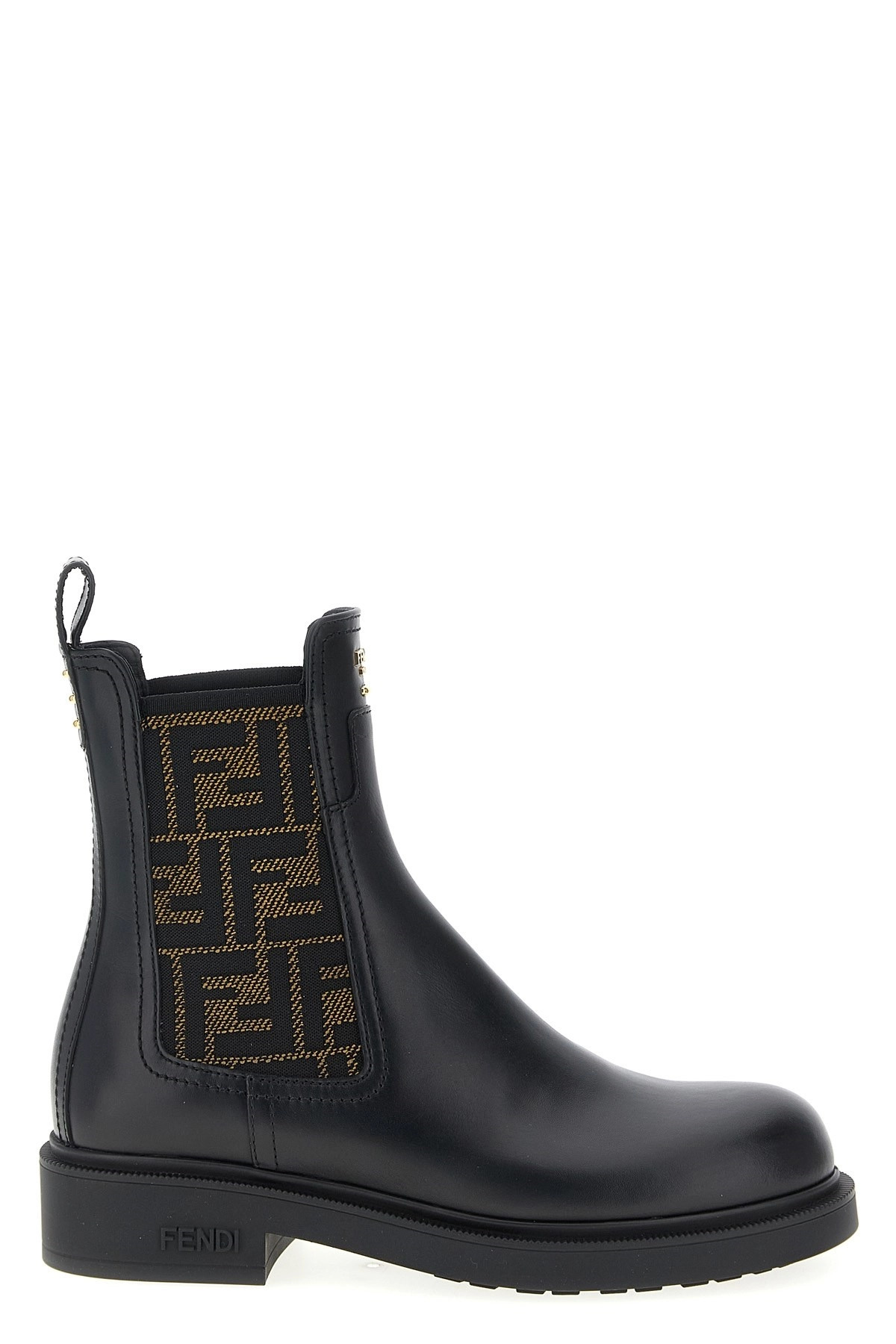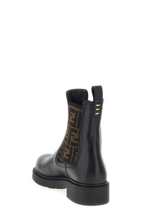 cod. 8T8576A379F1TOG 'Fendi Filo' leather ankle boots, biker style with side elastic insert in iconic FF fabric pattern, rounded toe, 'metal stitching Selleria' detail at the back, front metal lettering logo, rubber sole. Color: Black Size & Fit: EU WOMEN Composition: 100% calfskin leather (Bos Taurus) Made in: Italy