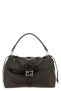 cod. 7VA665AV8BF0H3A 'Fendi Flux Maxi Messanger' smooth calf leather handbag with drawstring and flap closure with 'Tuc' FF logo metal closure, removable leather handle and adjustable and removable tape shoulder strap. Color: Brown Size & Fit: W 45 x H 23 x D 20 Composition: 100% calfskin leather (Bos Taurus) Made in: Italy