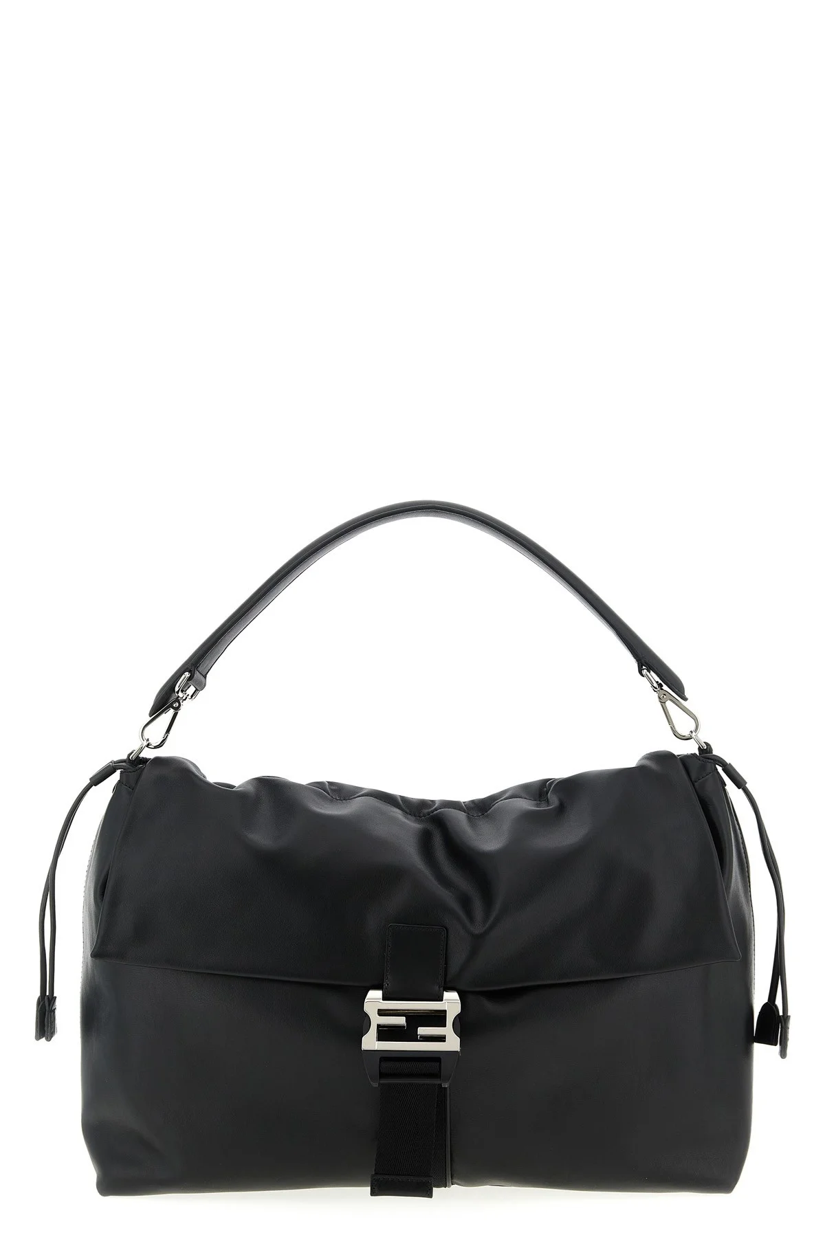 cod. 7VA665AV8BF0GXN Fendi Flux' maxi shoulder bag in smooth calf leather, flap closure with FF-shaped metal tuc, inner drawstring, removable handle, adjustable and removable tape shoulder strap. Color: Black Size & Fit: W 45 x H 23 x D 20 cm Composition: 100% calfskin leather (Bos Taurus) Made in: Italy