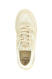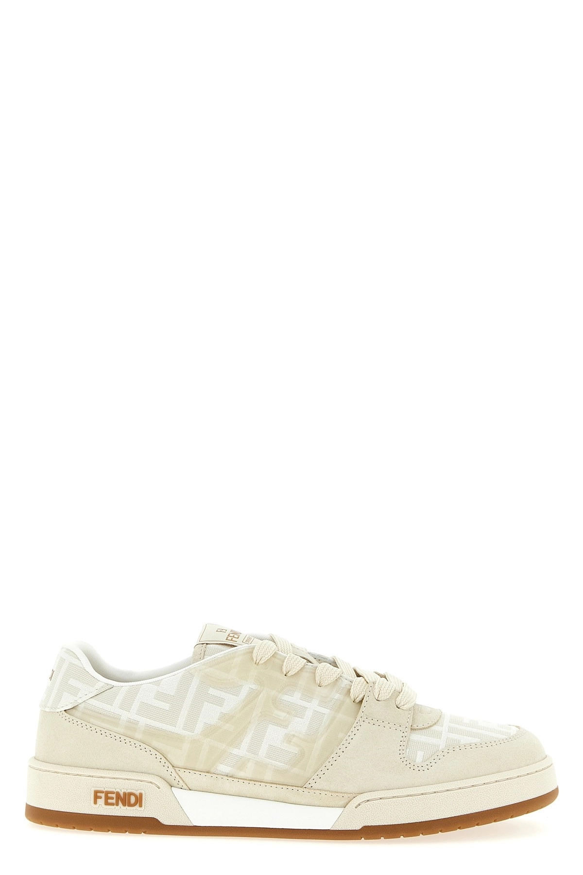 cod. 7E1688AQ6IF1NJ3 'Fendi Match' FF jacquard and suede sneakers, side silicone FF logo, lace-up closure, rubber sole with embossed lettering logo on the side. Color: Beige Size & Fit: UK MEN Composition: 100% calfskin leather (Bos Taurus) Made in: Italy