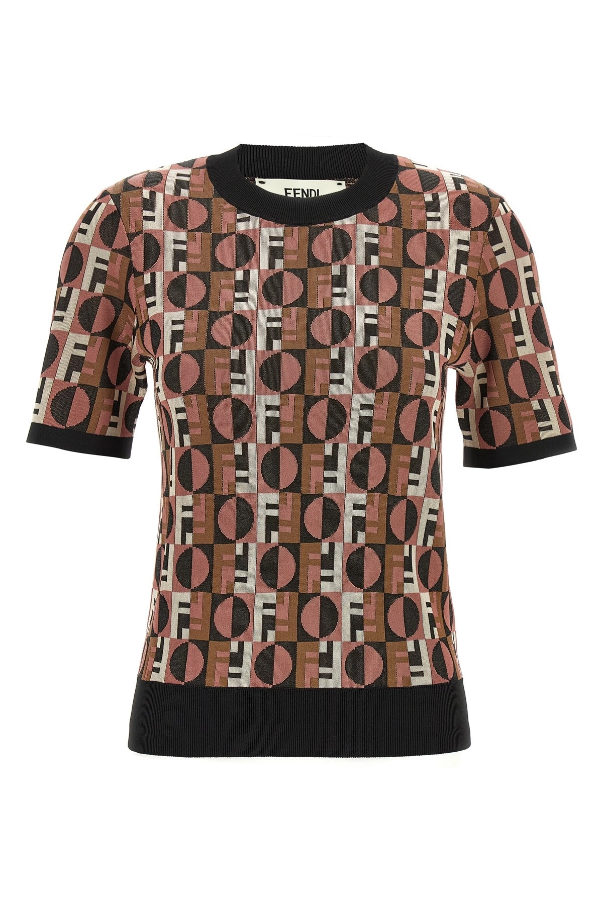 cod. FZXE04AYLVF1T6N Jacquard shiny viscose sweater with three-dimensional effect geometric pattern 'Fendi Optical' effect, crew neck, and short sleeves. Color: Pink Size & Fit: Slim fit Composition: 100% viscose Made in: Italy