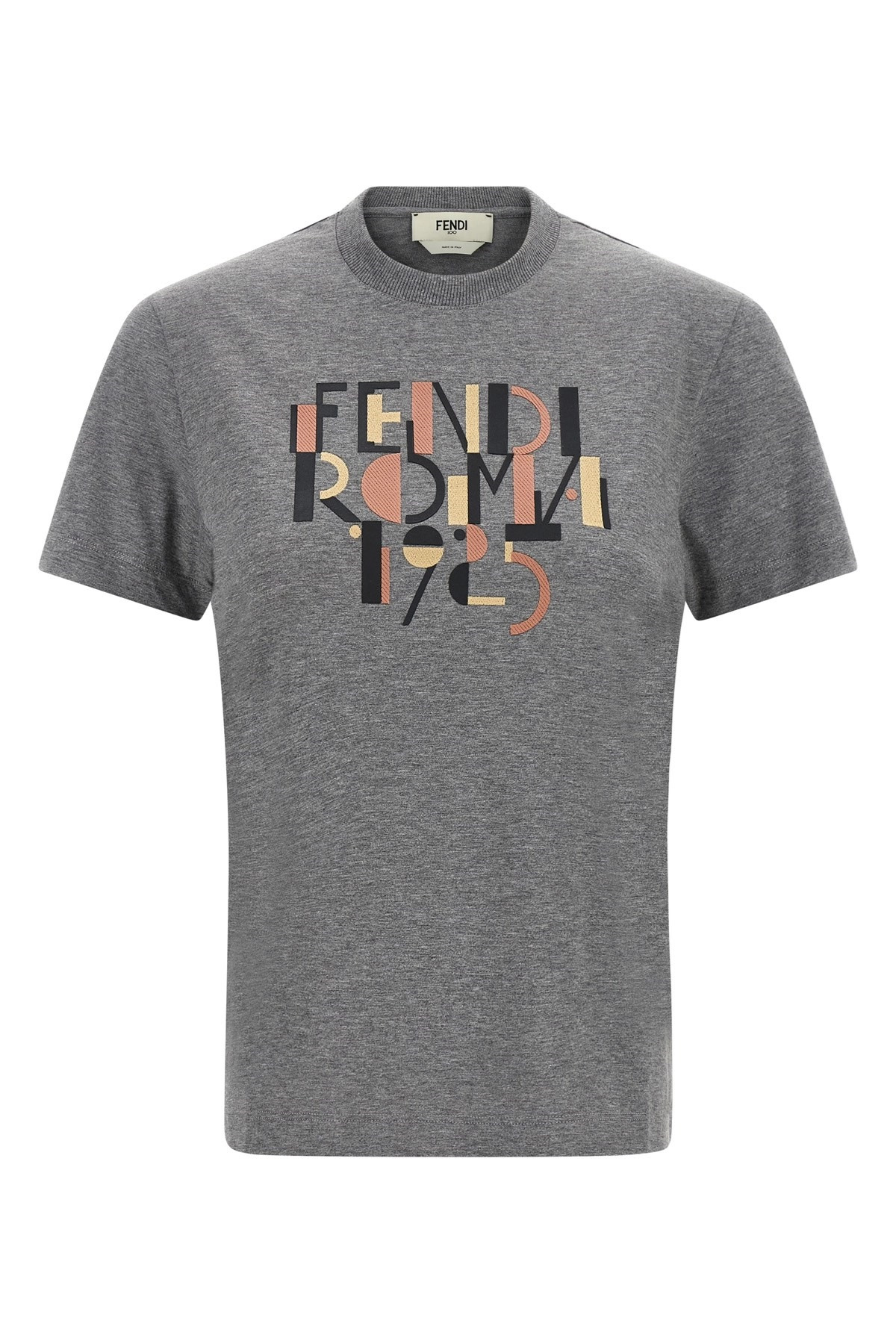 cod. FS7254AVF8F0TAZ Cotton melange jersey t-shirt, print and embroidery 'Fendi Roma 1925' front, crew neck, short sleeves. Color: Gray Size & Fit: true to size fit Composition: 100% cotton Made in: Italy
