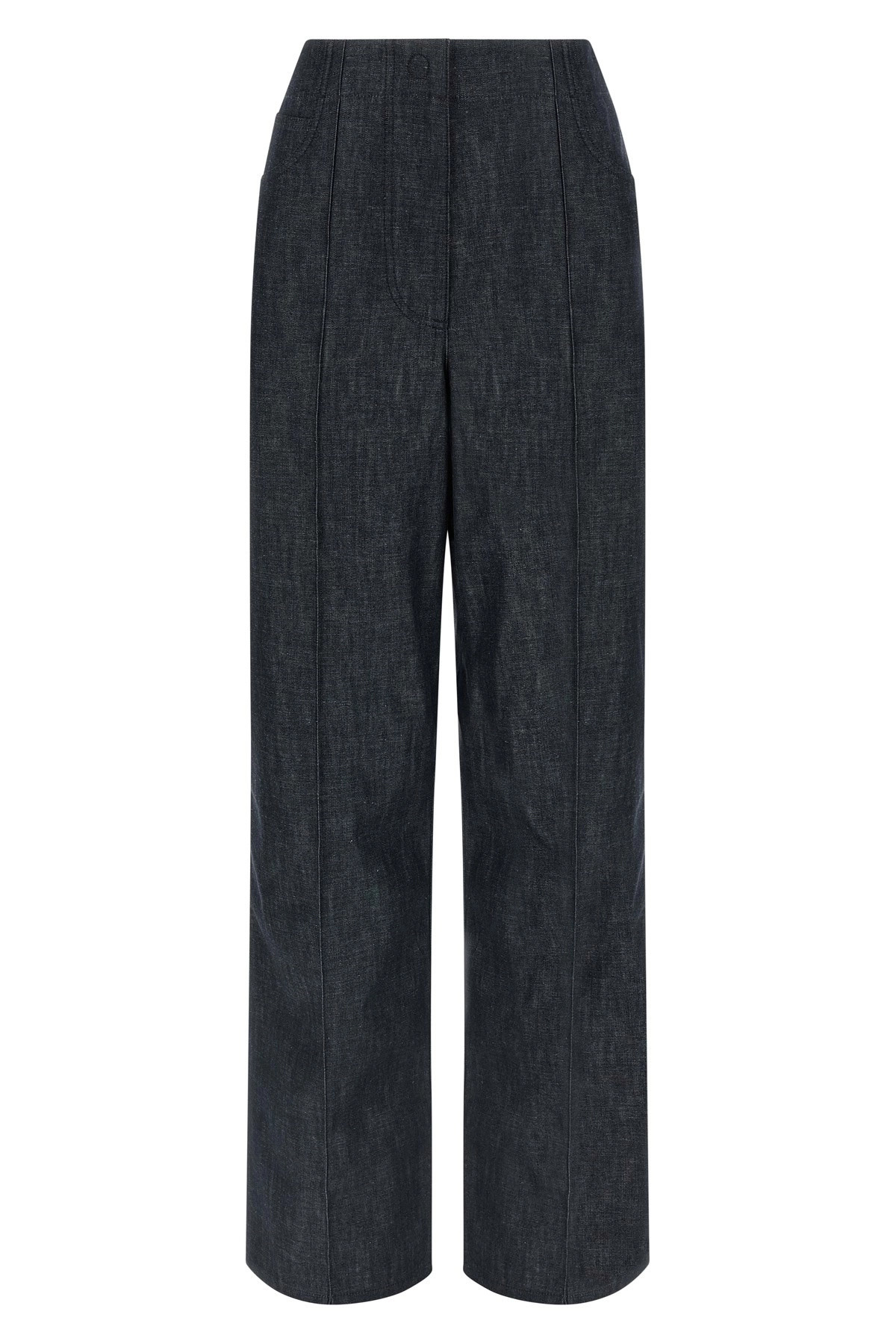 cod. FLP878AVF2F0EX7 Ultra light denim chambray jeans, high waist, wide leg, stitched pleat, front zip and snap button closure, five pockets, leather 'Fendi Roma' patch on the back. Color: Blue Size & Fit: true to size fit Composition: 100% cotton Made in: Italy