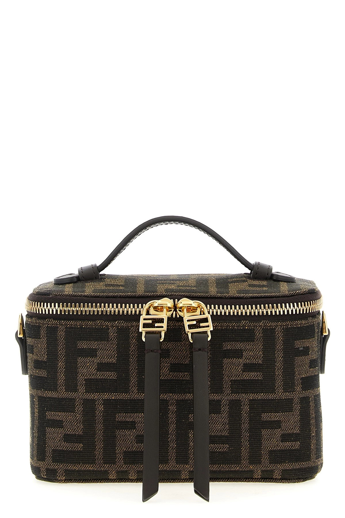 cod. 8BS108AFPMF1GL7 'Fendi Vanity' FF jacquard fabric handbag with smooth leather details, fixed handle, zip closure, chain and removable leather shoulder strap. Color: Brown Size & Fit: W 16 x H 11 x D 8 cm Composition: 29% polyester 28% polyurethane 28% polyamide 15% cotton Made in: Italy