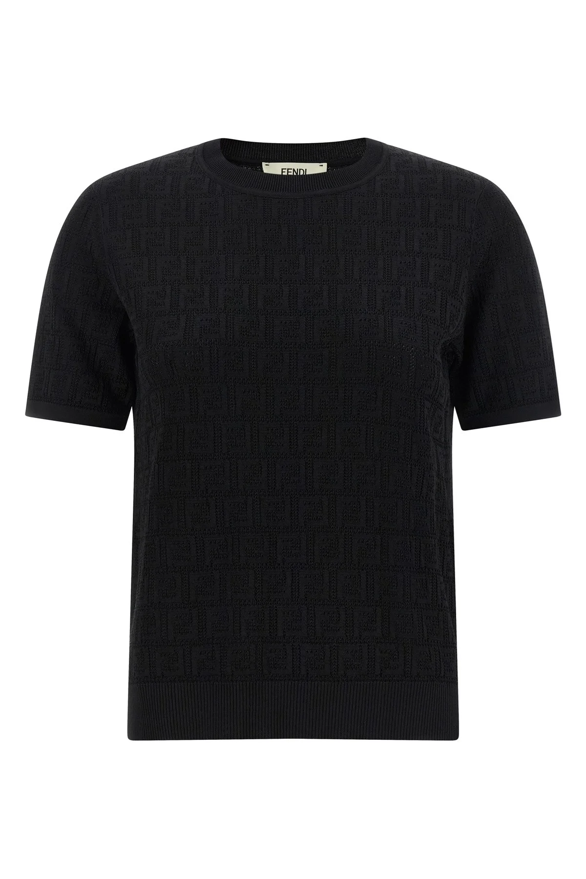 cod. FZXD57AUZRF0GME Cotton yarn and viscose sweater with all-over FF pattern intarsia, crew neck, short sleeves, side slits. Color: Black Size & Fit: true to size fit Composition: 54% cotton 46% viscose Made in: Italy