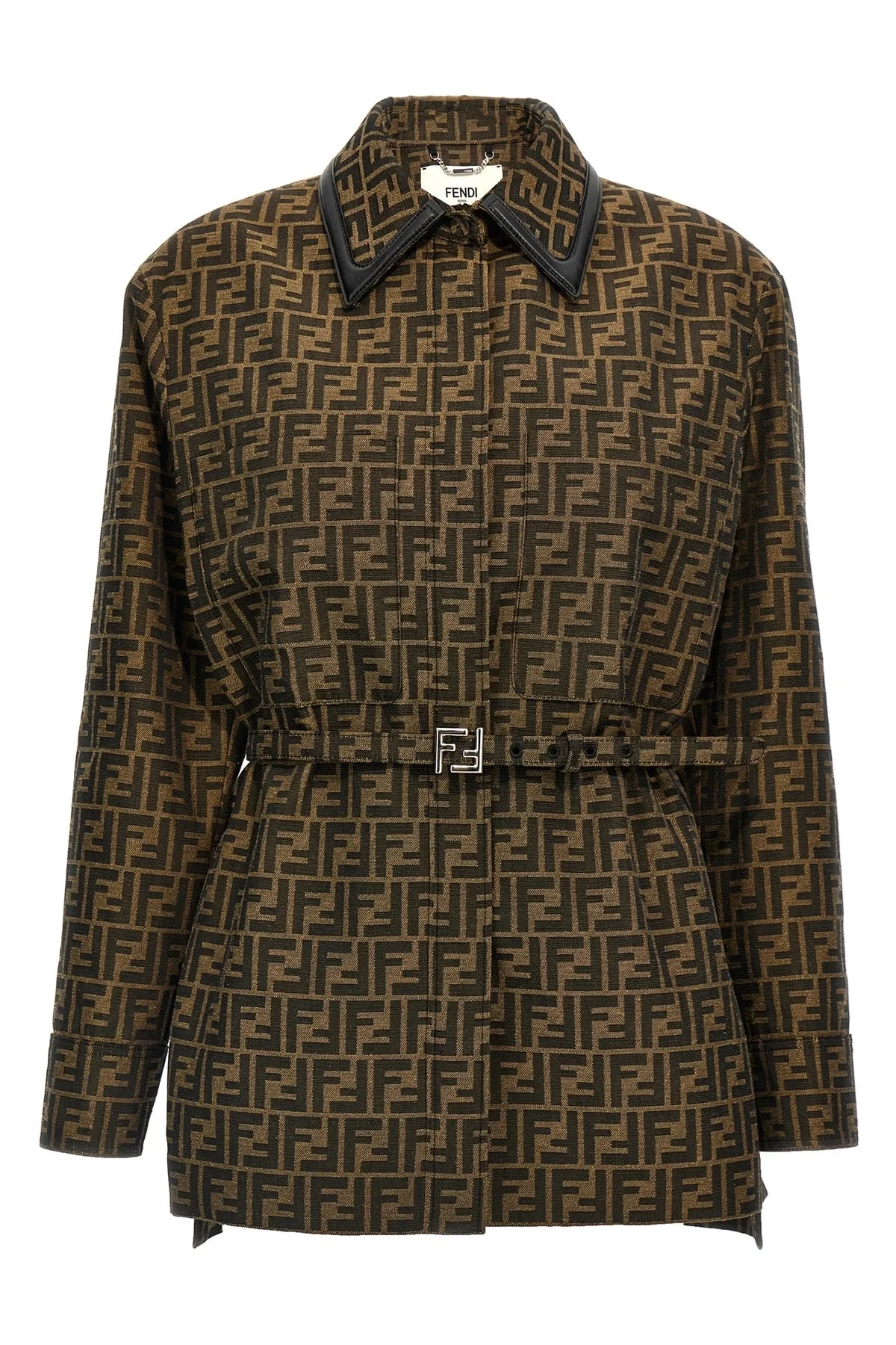 cod. FJ7564A5W3F118W All-over 'FF' logo pattern cotton blend jacket, leather details, button closure and matching waist belt, pockets, long cuffed sleeves. Color: Brown Size & Fit: true to size fit Composition: 65% polyester, 35% cotton Made in: Italy PROMO CODE NOT APPLICABLE