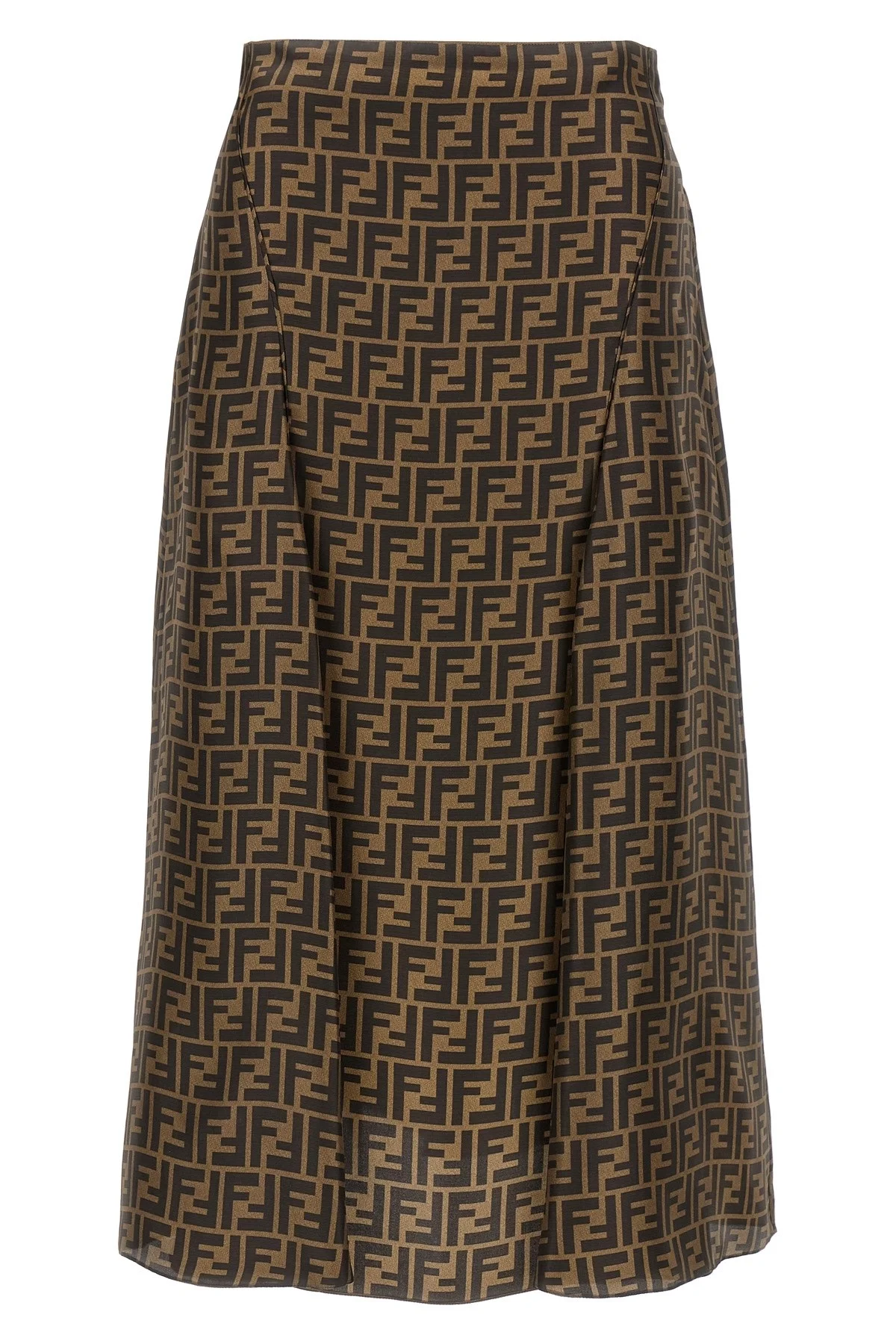 cod. FQ7601A8G3F1440 High waist skirt in printed silk twill with all-over FF pattern, flared flowing fit, front pin tucks, back zip closure. Color: Brown Size & Fit: true to size fit Composition: 100% polyester Made in: Italy