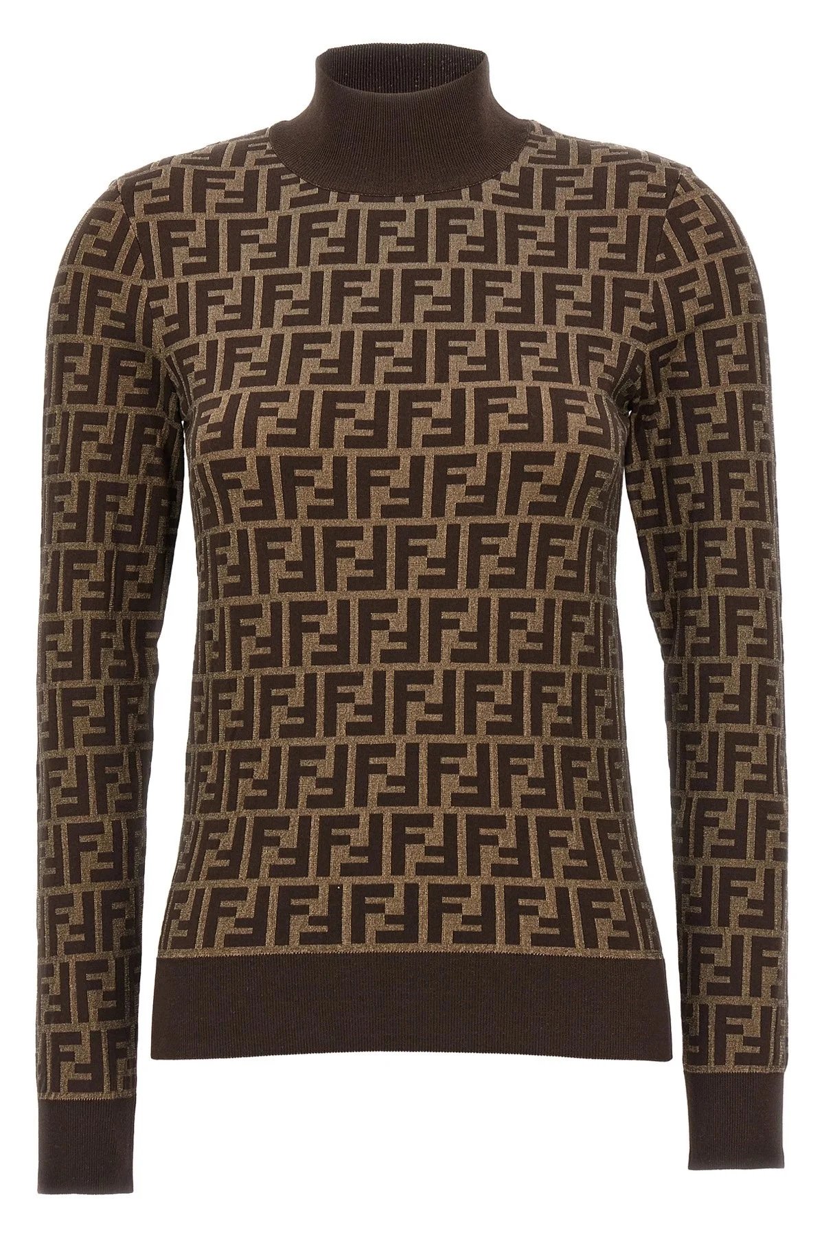 cod. FZXC73ASJTF0GGE Cotton sweater with all-over 'FF' logo pattern, high neck, long cuffed sleeves. Color: Brown Size & Fit: true to size fit Composition: 100% cotton Made in: Italy