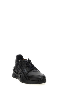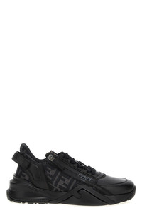 cod. 7E1392AJZHF1DV5 'Flow' leather sneakers with elastic laces, zip on the side and wavy sole with carved F, embossed Fendi Flow lettering logo print on the heel, FF jacquard fabric details, FF detail on Lycra® tongue, lightweight rubber sole with diagonal F detail. Color: Black Size & Fit: UK MEN Composition: 100% calf leather