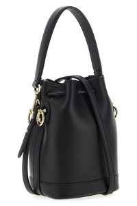 cod. 8BS109AYJ1F0KUR 'Mon Tresor' mini bucket bag in calf leather, front lettering logo and metal details with gold finish, drawstring closure, removable handle, removable shoulder strap. Color: Black Size & Fit: W 13.5 x H 19 x D 11 cm Composition: 100% calfskin leather (Bos Taurus) Made in: Italy