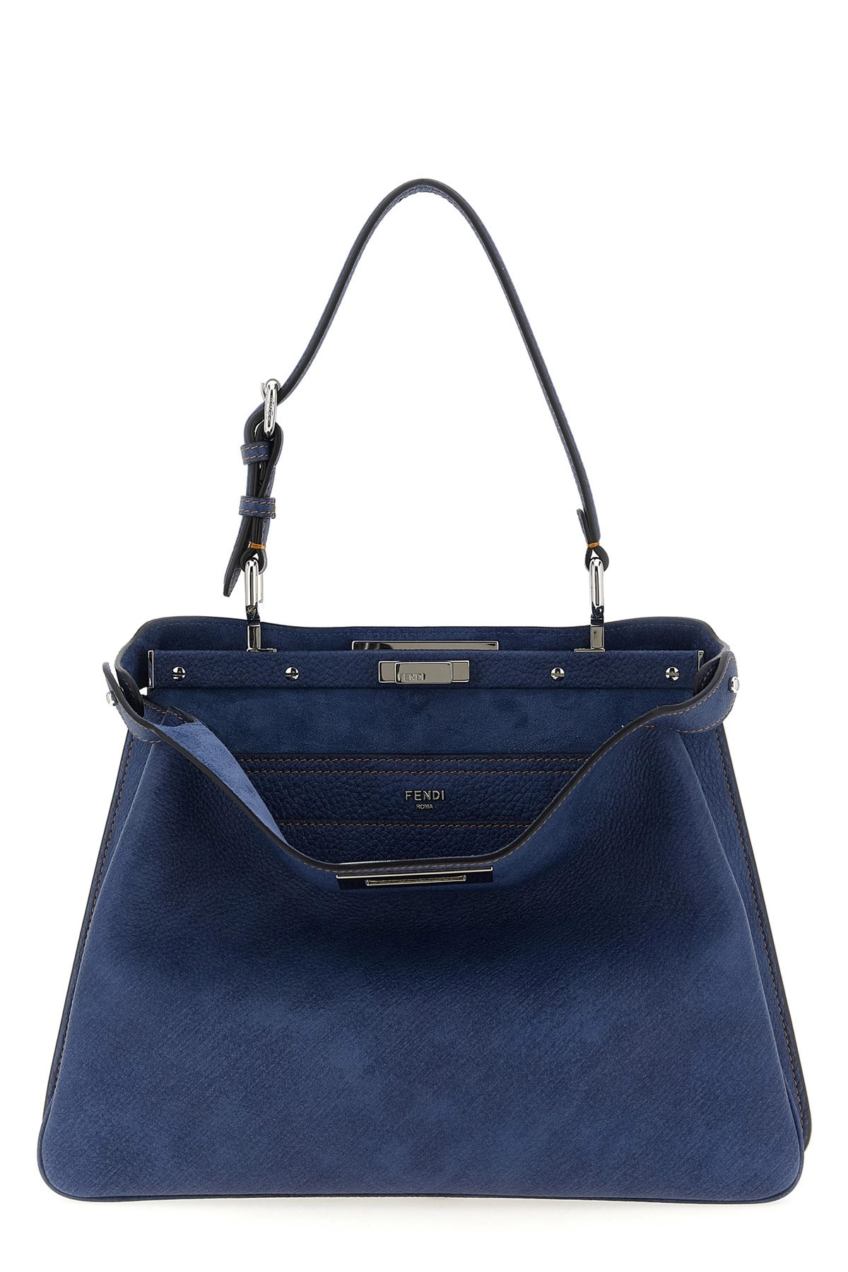 cod. 8BN353AUR3F04QL 'Peekaboo Soft Medium' shoulder bag in Roman Leather with denim effect, contrast stitching, iconic metal swivel closure on both sides, adjustable handle. Color: Blue Size & Fit: W 33 x H 25.5 x D 10 cm Composition: 100% calfskin leather (Bos Taurus) Made in: Italy