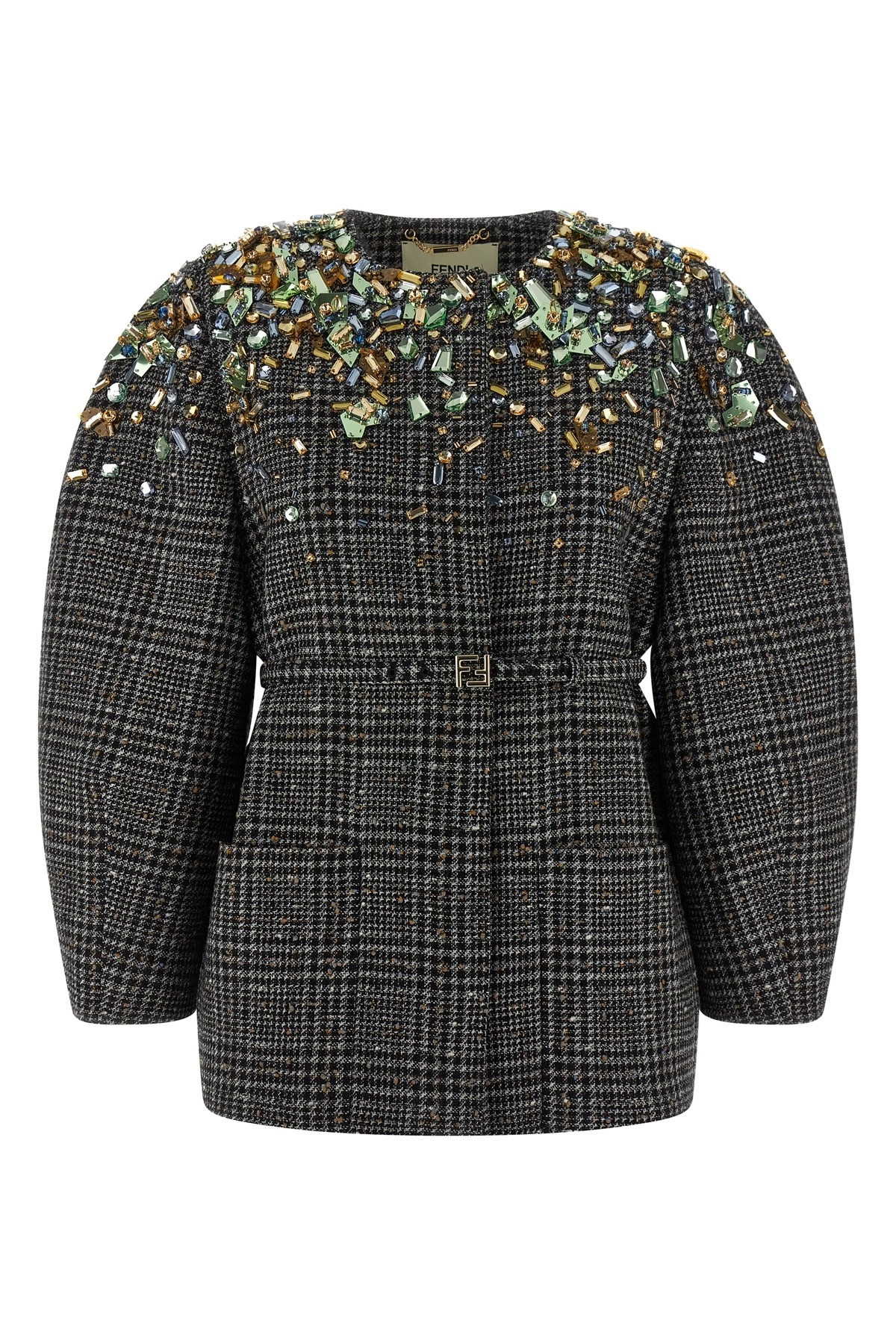 cod. FJ7647AYNCF1T6F Check wool tweed jacket, crystal embroidery at the top, front button closure, removable and adjustable waist belt with logo buckle. Color: Gray Size & Fit: True to size fit Composition: 91% virgin wool 7% cotton 2% polyamide Made in: Italy