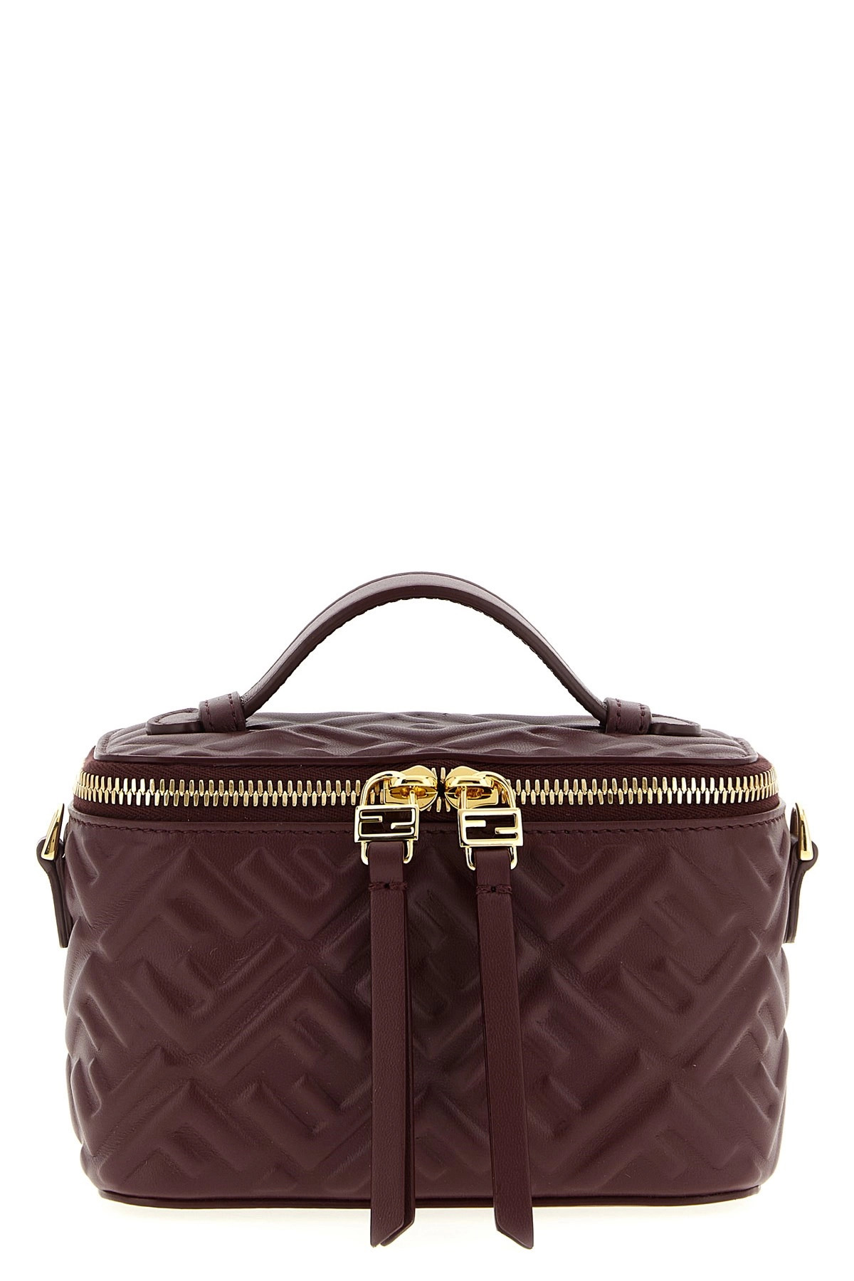 cod. 8BS108AAJDF0YPU 'Vanity' nappa crossbody bag with embossed 'FF' pattern, top case model, double slider zip closure with 'FF' metal details, fixed handle and removable leather and chain shoulder strap. Color: Red Size & Fit: W 16 x H 11 x D 8 cm Composition: 100% lamb leather (Ovis aries) Made in: Italy