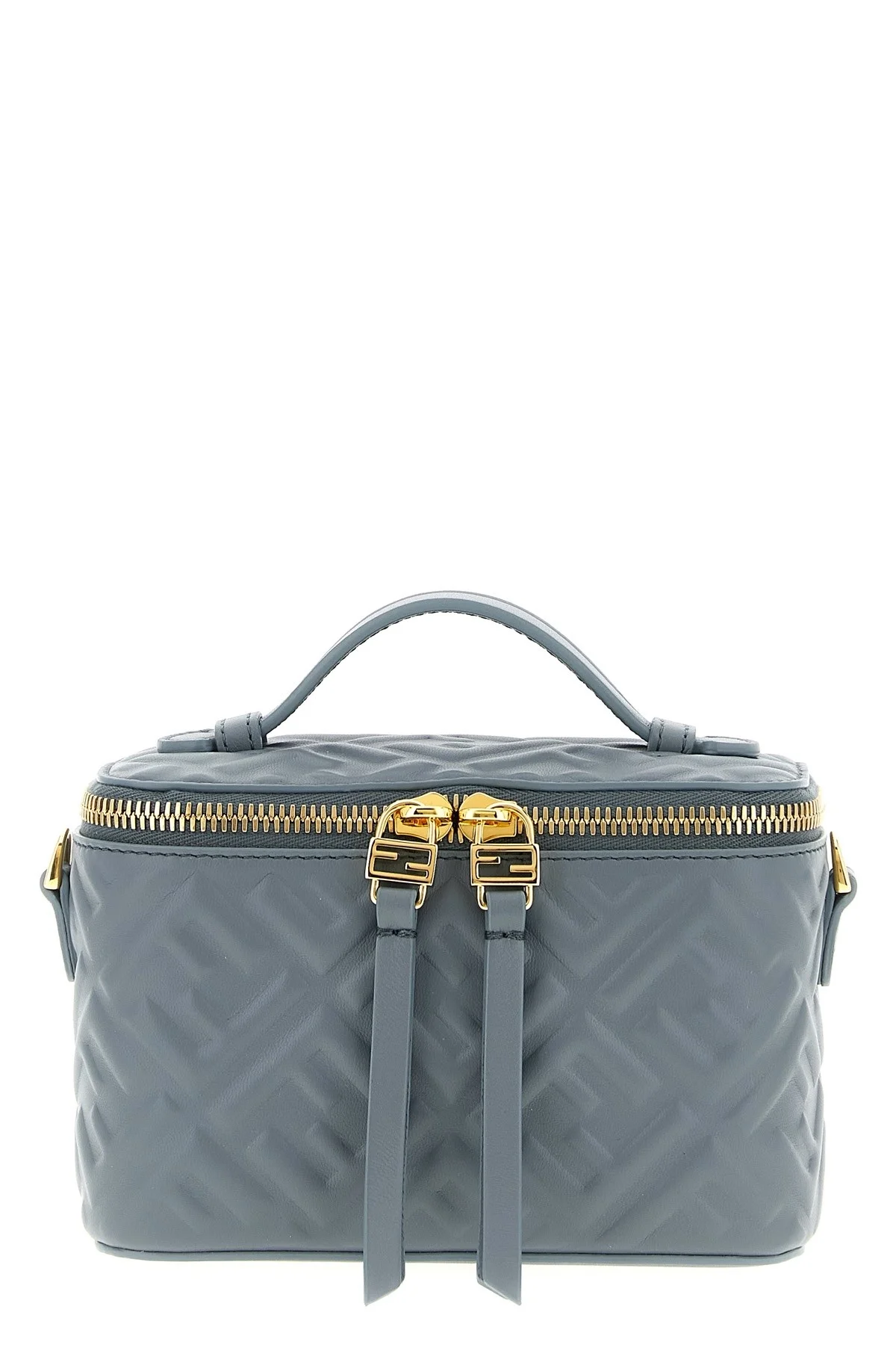 cod. 8BS108AAJDF1UJC 'Vanity' nappa crossbody bag with embossed 'FF' pattern, top case model, double slider zip closure with 'FF' metal details, fixed handle and removable leather and chain shoulder strap. Color: Light Blue Size & Fit: W 16 x H 11 x D 8 cm Composition: 100% lamb leather (Ovis aries) Made in: Italy