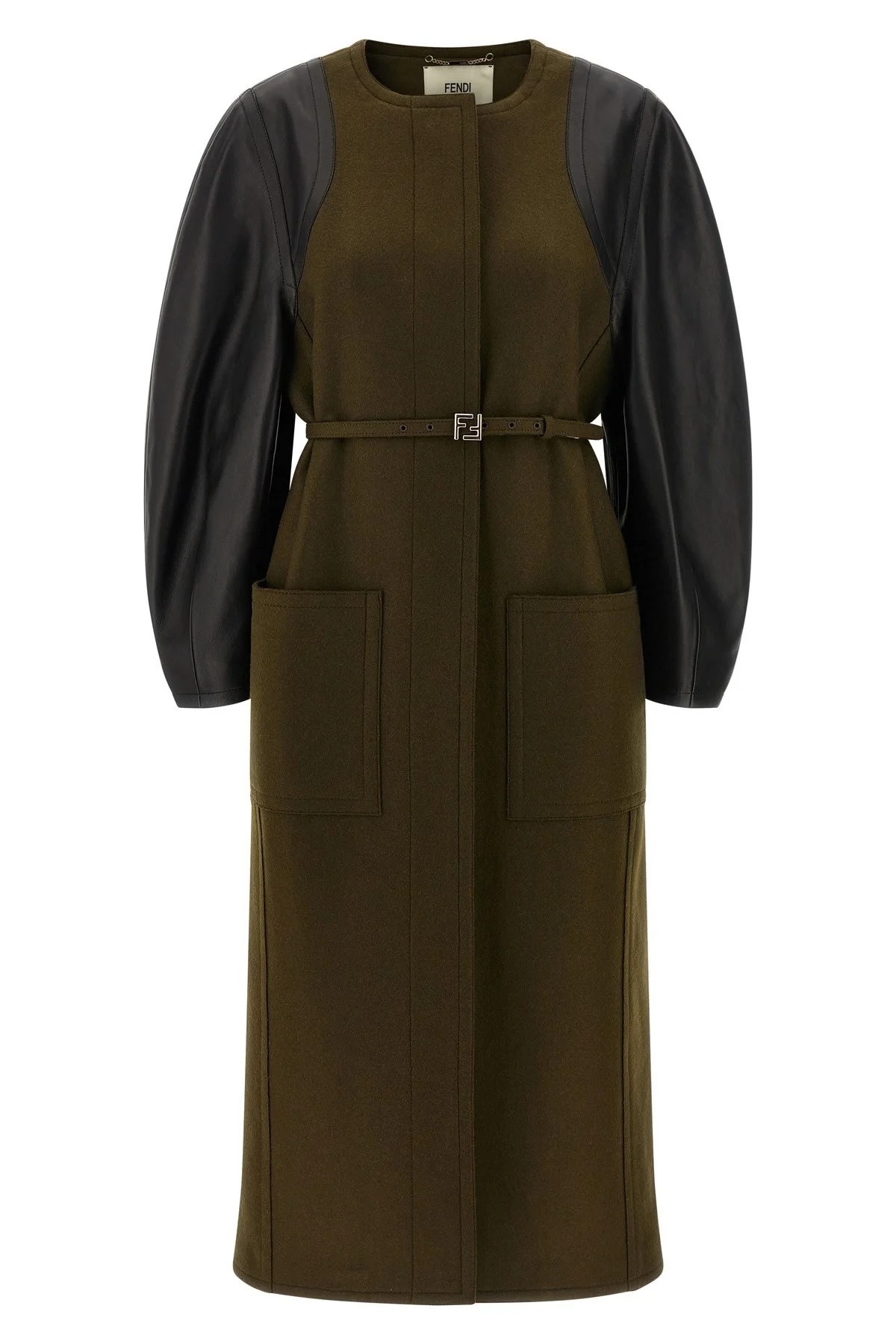 cod. FF6150AJ0KF1T6G Wool Felt' wool crewneck coat with concealed front button closure, long leather sleeves, side pockets, mini belt at the waist with adjustable and removable logo. Color: Green Size & Fit: True to size fit Composition: 100% viscose Made in: Italy