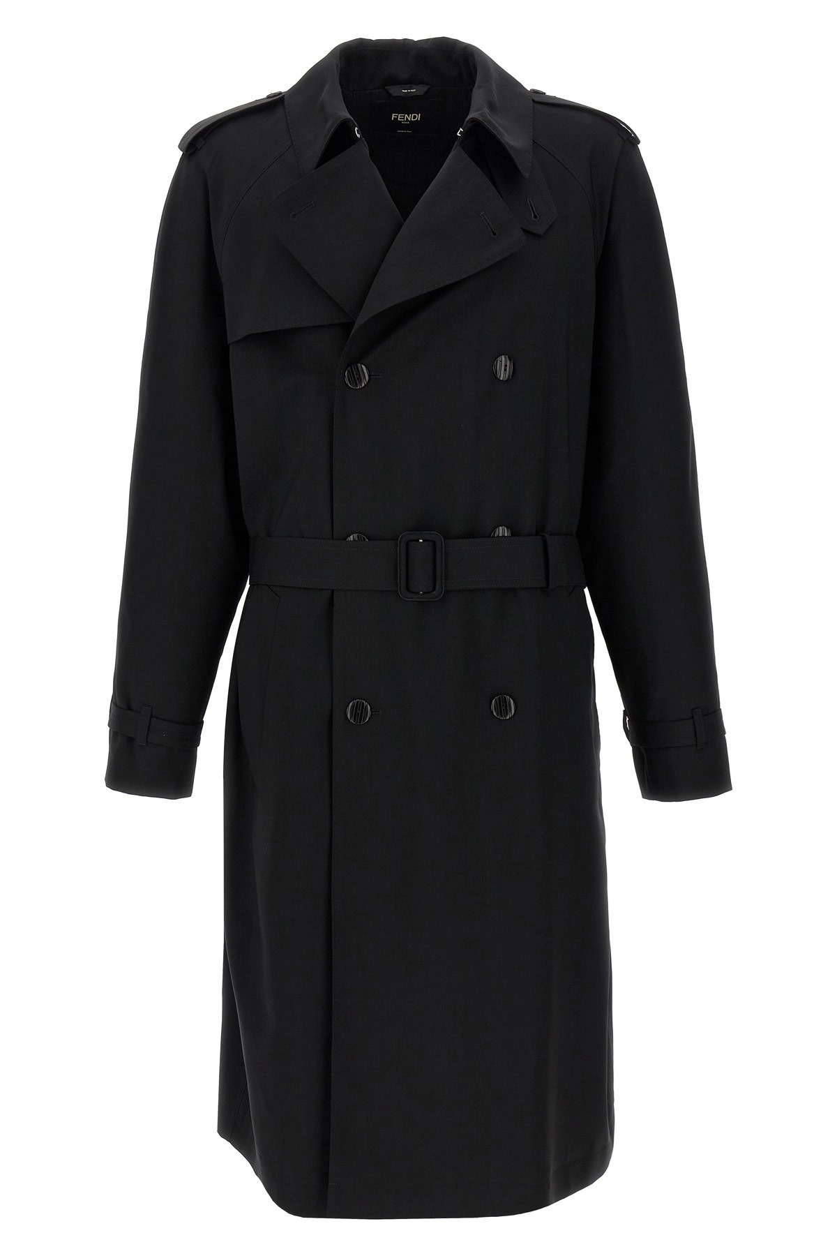 cod. FF0830ASCHF0QA1 Double-breasted wool trench coat with front button closure, removable chin strap, FF monogram jacquard logo satin lining, long cuffed sleeves, pockets, slit and tone-on-tone logo embroidery on the back, and removable belt. Color: Black Size & Fit: true to size fit Composition: 100% virgin wool Made in: Italy