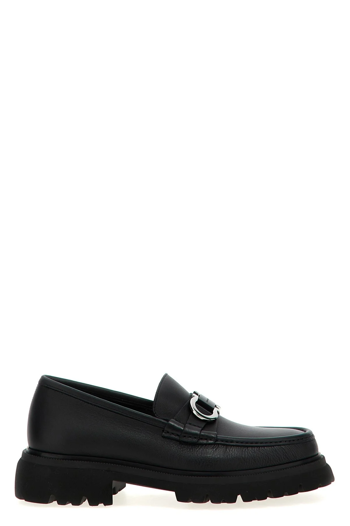 cod. 773850NERO 'Cocoon' leather loafers with front metal hook detail, rubber tank sole. Color: Black Size & Fit: US FERRAGAMO SIZE EEE Fit Composition: 100% calfskin leather (Bos Taurus) Made in: Italy