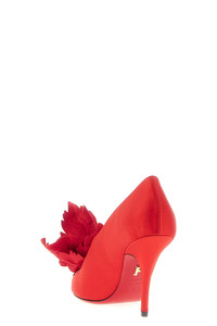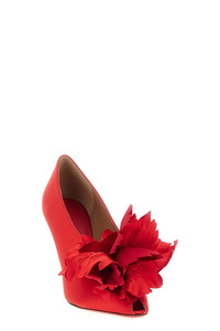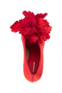 cod. 787583FLAMERED 'Galia' satin pumps with peep toe model with slightly closed neckline and tone-on-tone maxi flower application on the front, stiletto heel, leather sole. Color: Red Size & Fit: US FERRAGAMO SIZE - C fit Heel: 9 cm Composition: 90% viscose, 10% lamb leather Made in: Italy