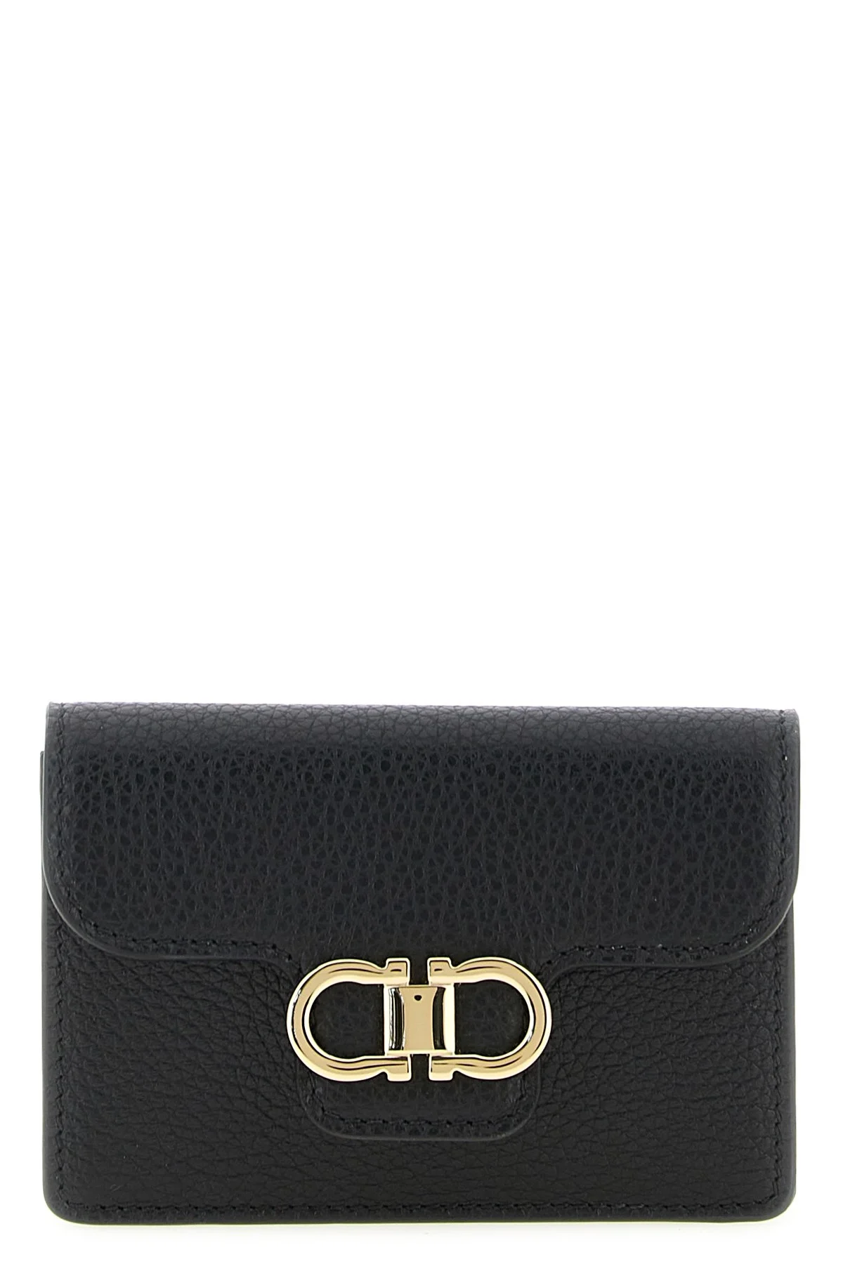cod. 785795NEROFLAMERED Hammered calf leather keyring, flap closure with snap button and front metal 'Gancini' logo detail, contrasting smooth leather lining, metal ring chain, back pocket. Color: Black Size & Fit: W 11 x H 8 x D 2 cm Composition: 100% calfskin leather (Bos Taurus) Made in: Italy
