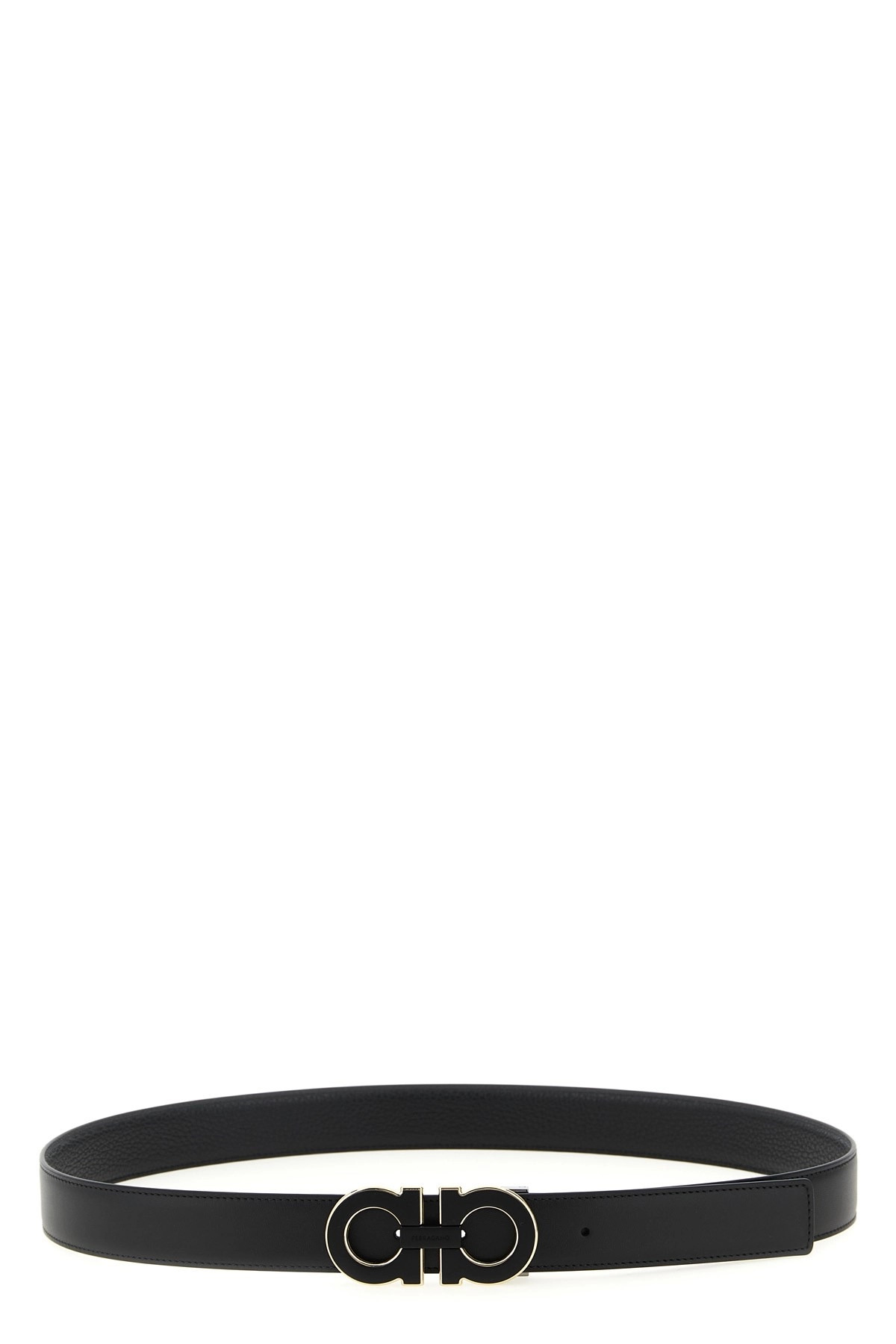 cod. 786992NERO Reversible hammered and smooth leather belt with metal 'Gancini' buckle. Color: Black Size & Fit: H 3 cm Composition: 100% calfskin leather (Bos Taurus) Made in: Italy